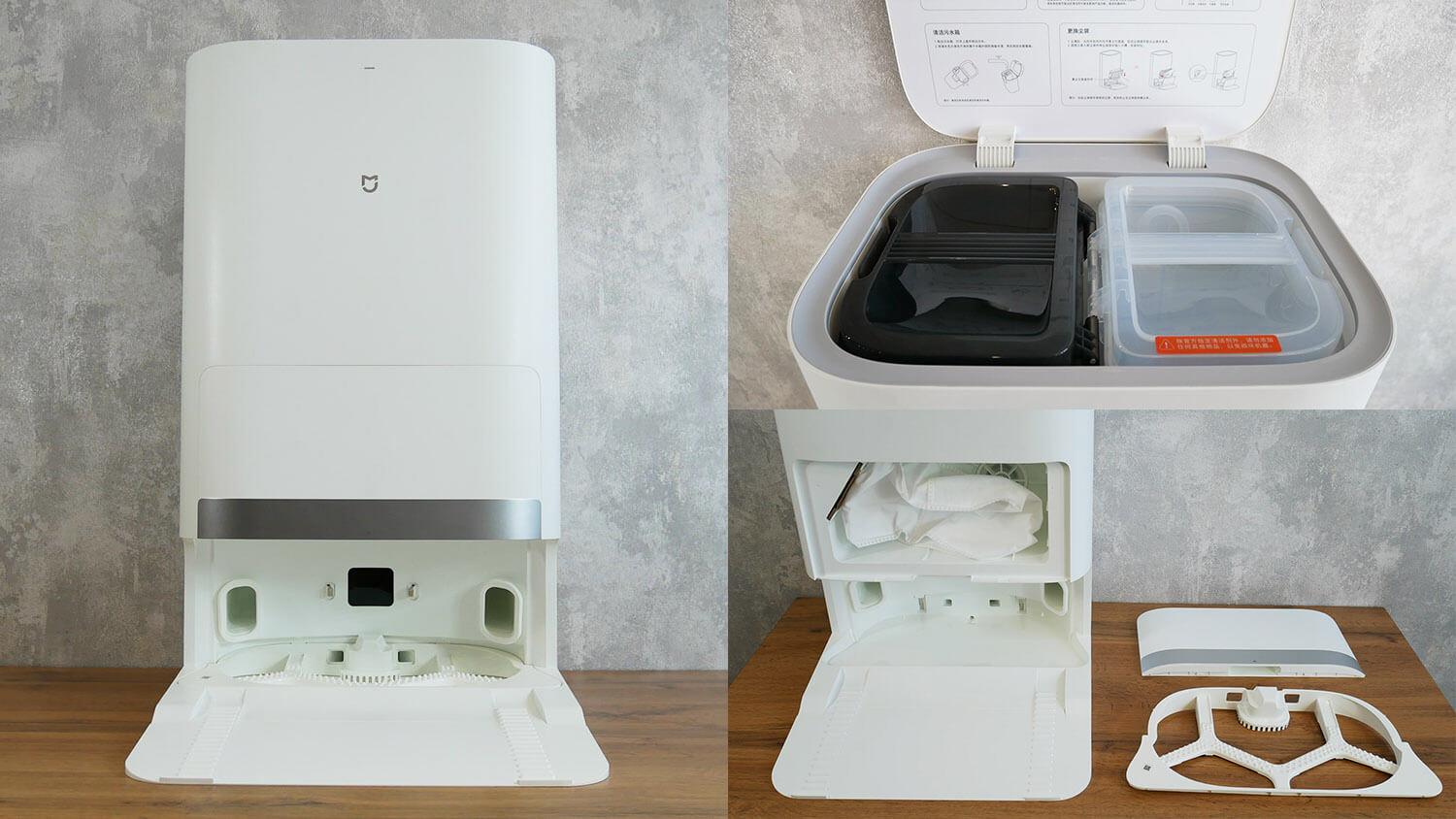 Dulkių surinkėjas yra po viršutiniu dangčiu. Filtravimo sistema yra HEPA pagrindu ir turi tinklelio filtrą. Robotas neturi įmontuoto vandens bako, nes stotelėje nėra purkštukų vandeniui pumpuoti į robotą. Šluostės stotelėje sudrėkinamos tik skalbimo metu.