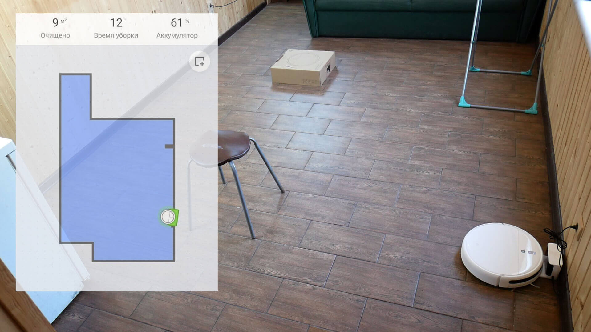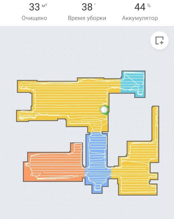 Pirmiausia išbandykime „Xiaomi Mi Robot Vacuum Mop 1C“ navigaciją kambaryje su kliūtimis. Pirmiausia robotas dulkių siurblys pervažiuoja visą prieinamą plotą vingiuotu raštu, o tada palei perimetrą. Jis neužsikabino ant džiovyklės, bet neužkliūno už kėdės kojų ar dėžės. Navigacija nėra pati geriausia tarp kamerinių robotų, tačiau didelių nusiskundimų nėra. Svarbiausia, kad neliko neišvalytų vietų, o robotas be problemų grįžo į įkrovimo bazę.