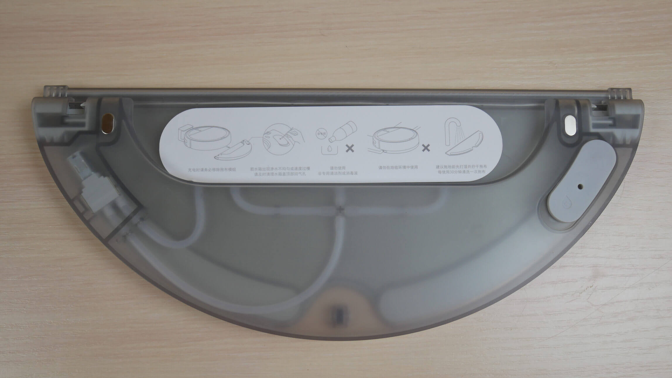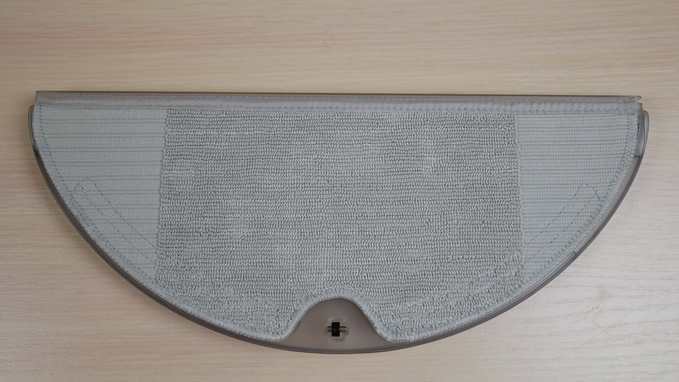 Valymo šluostės antgalis pritvirtintas apačioje. Pati valymo šluostė yra senesnio modelio, su plikomis dėmėmis šonuose, todėl robotui sunku valyti nešvarumus nuo grindjuosčių ir kitų interjero elementų.