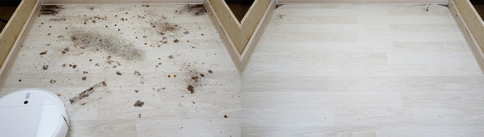 Nebuvo jokių nusiskundimų dėl kietų grindų cheminio valymo efektyvumo. Robotas dulkių siurblys galėjo surinkti nuo grindų naminių gyvūnėlių plaukus, plaukus, smulkias šiukšles ir net kačių ėdalą bei kraiką. Tik nedidelis kiekis šiukšlių liko kampuose, kur nepasiekia apvalūs robotai, ir mažoje vietoje prie kampų. Didžioji dalis šiukšlių buvo surinkta dulkių konteineryje, o kai kurie plaukai įsipainiojo į šepečius. Testas išlaikytas!