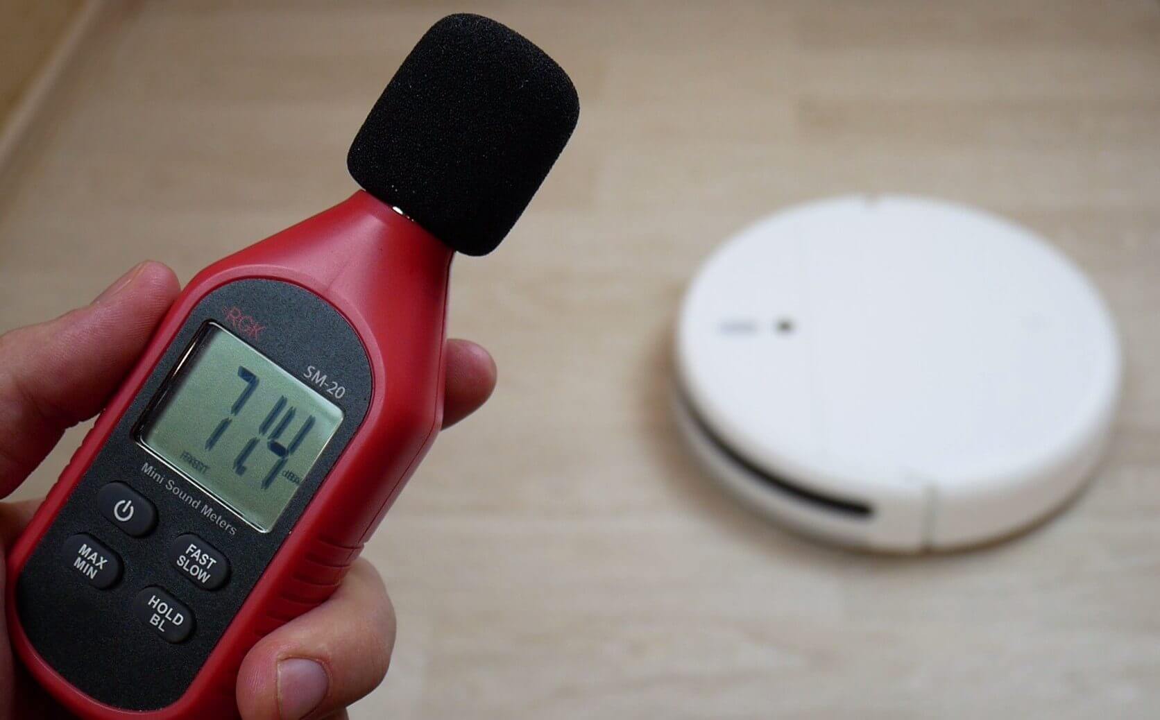 Galiausiai išmatavome „Xiaomi Mijia 1C“ triukšmo lygį skirtingais režimais. Esant minimaliai galiai, jis svyravo nuo 58 iki 60 dB. Standartiniu režimu jis pasiekė 61 dB, turbo režimu triukšmo lygis padidėjo iki 66 dB, o esant maksimaliai galiai pikas siekė 73 dB. Taip, šis robotas yra triukšmingas, nepaisant standartinės siurbimo galios.