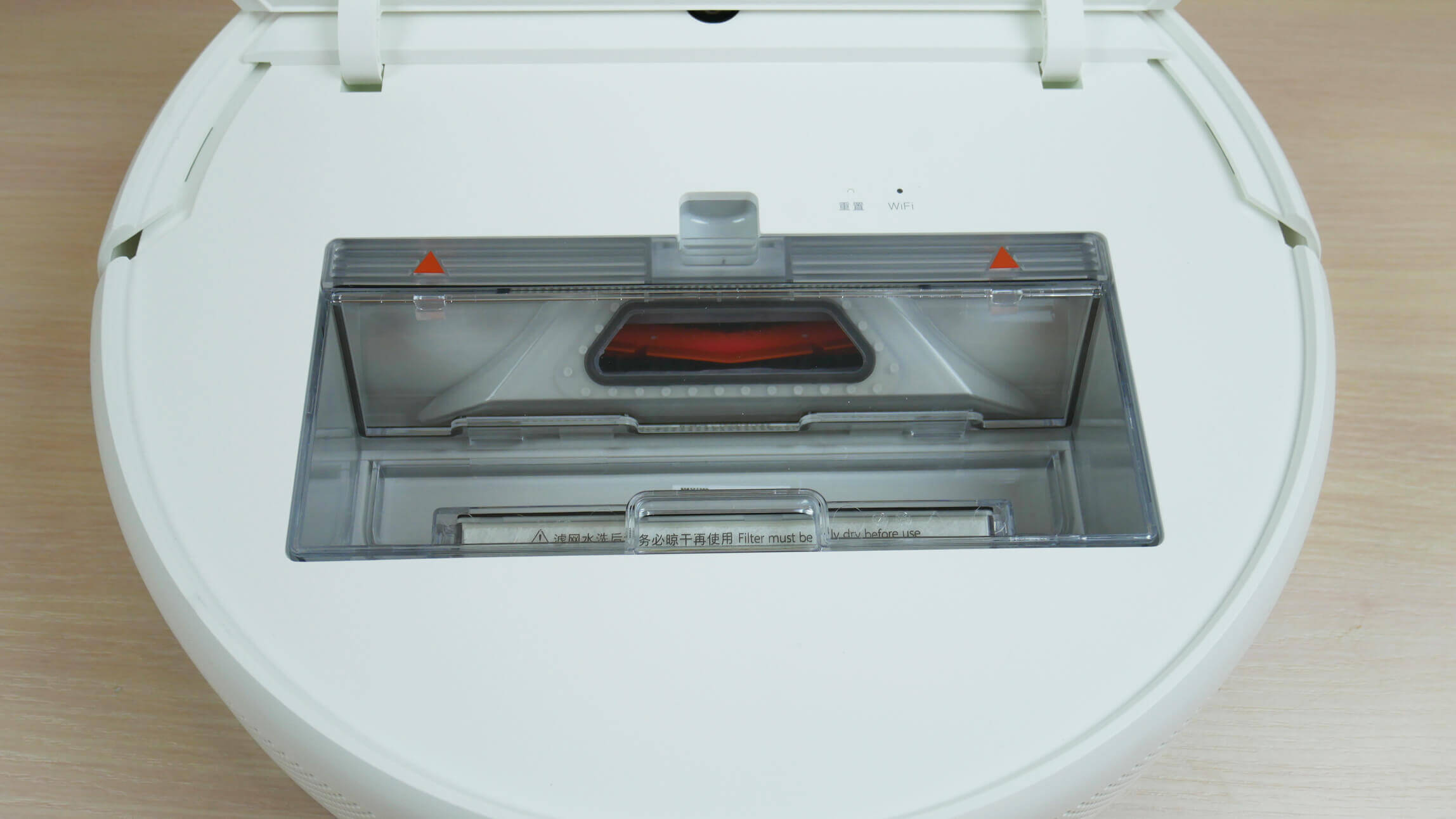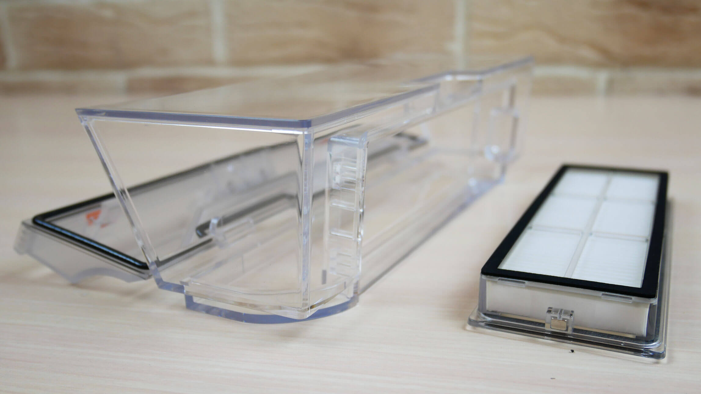 Dulkių surinktuvas yra po viršutiniu dangčiu. Jame telpa iki 600 ml sausų atliekų. Filtravimo sistema yra tik HEPA; nėra papildomo tinklelio.