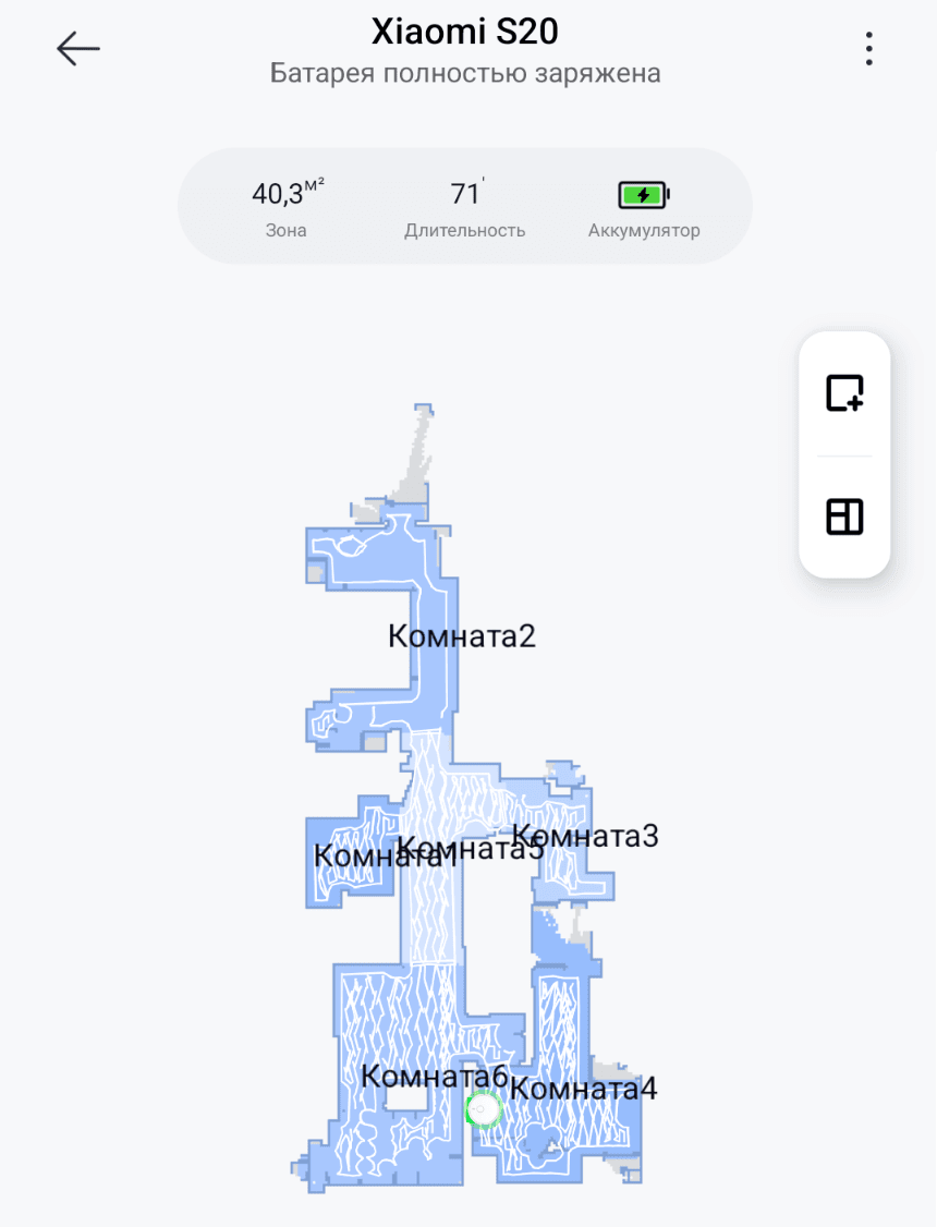 Taip pat išbandžiau baterijos veikimo laiką, kai robotas veikė maksimaliu galingumu ir įjungė šlapio valymo režimą. Jis veikė 70 minučių, išvalydamas 40 kvadratinių metrų naudingo ploto. Tačiau buvo įjungtas Y formos valymo režimas, kuris žymiai sulėtina valymo greitį. Iš tikrųjų robotas turbo režimu, naudodamas įprastą judėjimo algoritmą, gali padengti maždaug 60–70 kvadratinių metrų naudingo ploto.