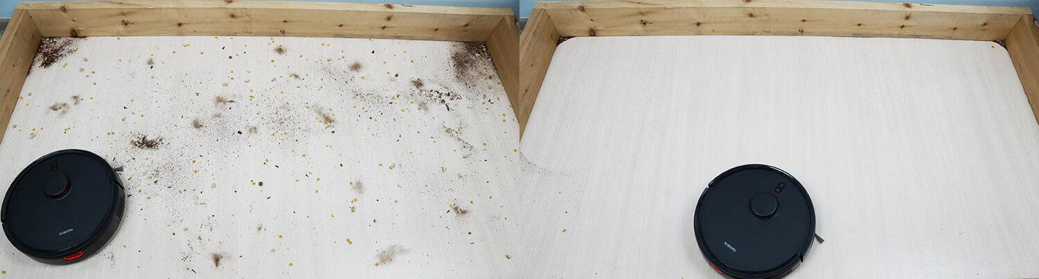 Nešvarumų šalinimo našumas yra toks pat, kaip ir daugumos panašių gaminių šioje kainų kategorijoje. Robotas dulkių siurblys gali pašalinti šiek tiek pridžiūvusius nešvarumus nuo grindų, nepalikdamas dryžių.