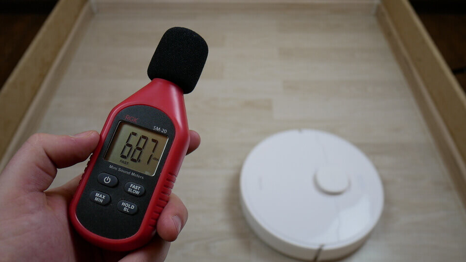 Galiausiai išmatavome „TROUVER LDS Finder“ triukšmo lygį skirtingais režimais. Tyliuoju režimu triukšmo lygis svyruoja nuo 58 iki 60 dB. Vidutiniu režimu jis siekia 65 dB, intensyvaus valymo režimu triukšmo lygis neviršija 66 dB, o esant maksimaliai galiai didžiausias triukšmo lygis buvo 67 dB. Šis robotas dulkių siurblys turi standartinį triukšmo lygį.