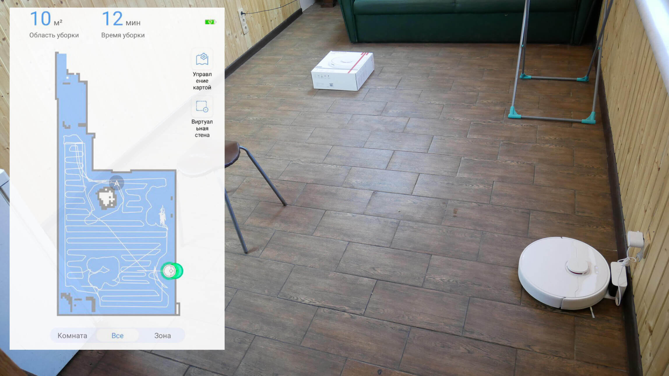 Ir galiausiai, judėkime toliau. Pirmiausia išbandykime „Xiaomi TROUVER LDS Finder“ navigaciją kambaryje su kliūtimis. Palikęs bazę, robotas dulkių siurblys pradeda valyti perimetrą. Džiovyklės kojos pasirodė esančios spąstai, tačiau robotas sugebėjo savarankiškai jas apeiti ir tęsti valymą. Išvalęs perimetrą, TROUVER LDS Finder pradeda valyti visą prieinamą plotą gyvatės būdu. Jis sugebėjo atskirai išvalyti aplink visas kėdės ir dėžės kojas, prieš grįždamas į bazę. Testas sėkmingas!