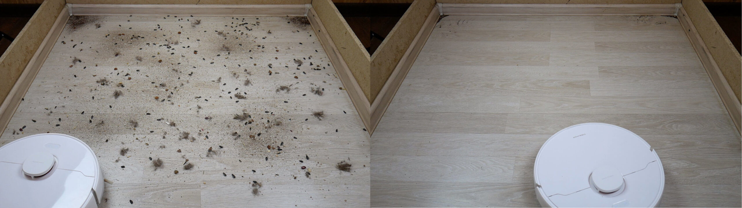 Laminuotų grindų šiukšlių surinkimo kokybė buvo aukštesnė nei vidutinė. Robotas visiškai surinko šiukšles ant grotelių, palikdamas tik nedidelį kiekį kampuose dėl apvalios formos. Nedidelis kiekis plaukų pateko į šoninį šepetį, o labai mažas – į centrinį. Didžioji dalis šiukšlių pateko į dulkių konteinerį. Testas išlaikytas!