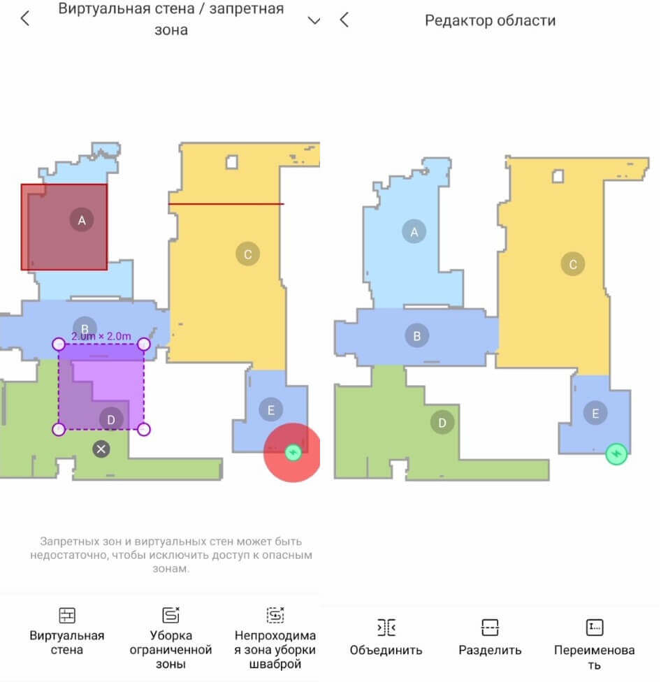 Žemėlapio valdymo režime galite rankiniu būdu redaguoti kambarių ribas ir pervadinti kiekvieną kambarį. Žemėlapyje taip pat galite nustatyti virtualias sienas ir draudžiamąsias zonas, įskaitant atskiras draudžiamąsias zonas šlapio valymo režimui.