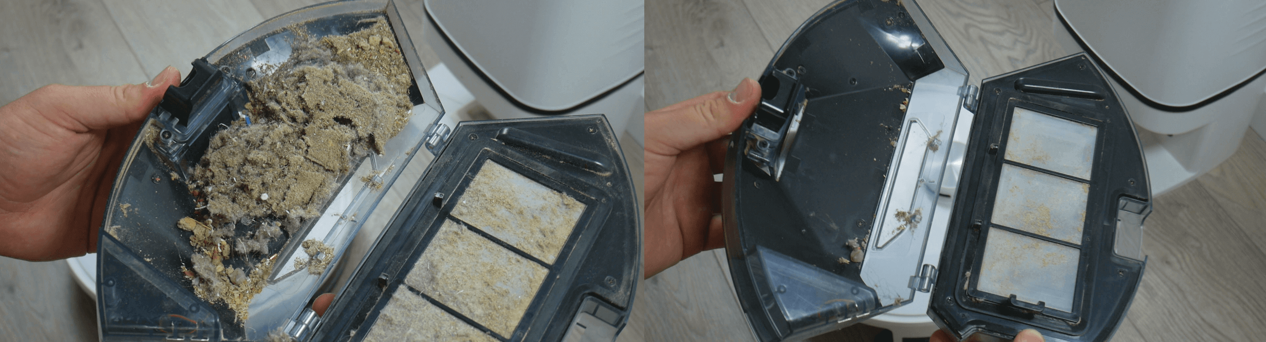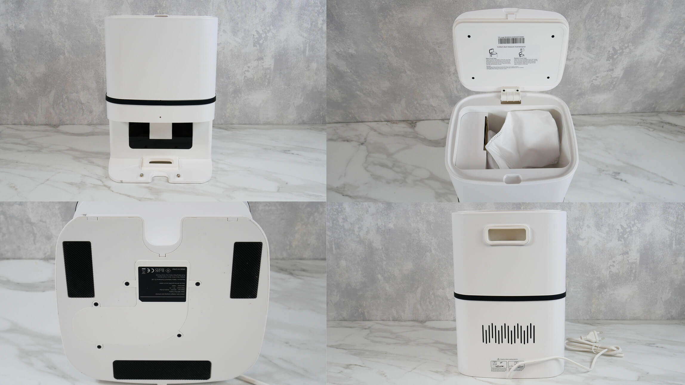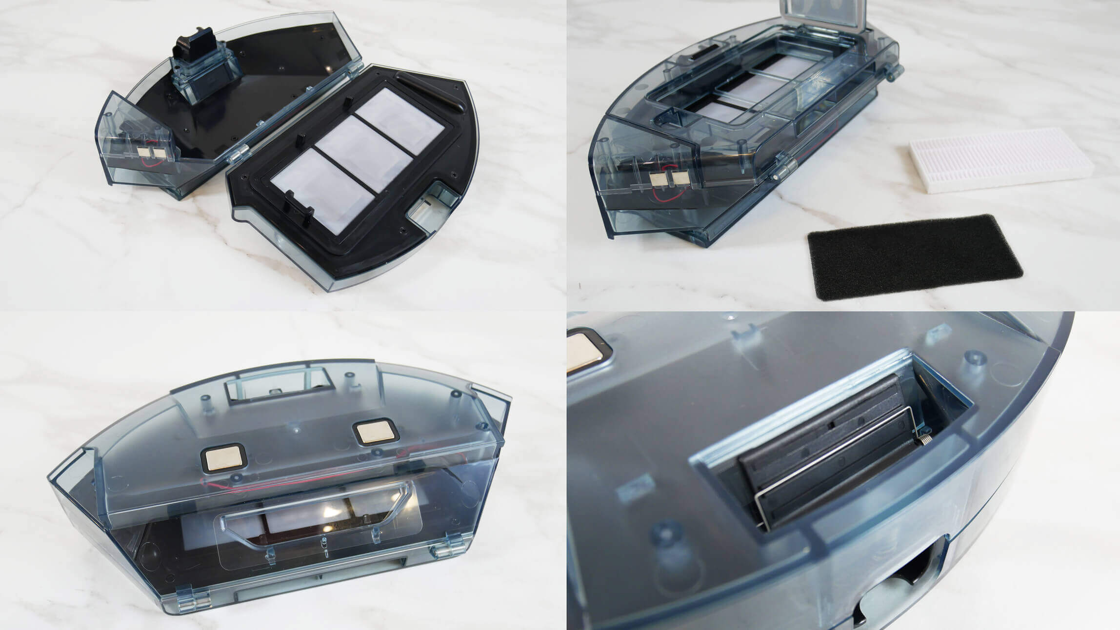 Gale sumontuotas dulkių surinktuvas, kurį galima plauti vandeniu. Jame yra triguba filtravimo sistema: putplasčio, HEPA ir tinklelio filtrai. Konteineryje patogiai laikomas dulkių surinktuvo valymo įrankis. Konteineris talpina iki 600 ml sausų atliekų. Stotelėje yra ventiliacijos anga su užuolaida, skirta savaiminiam valymui.