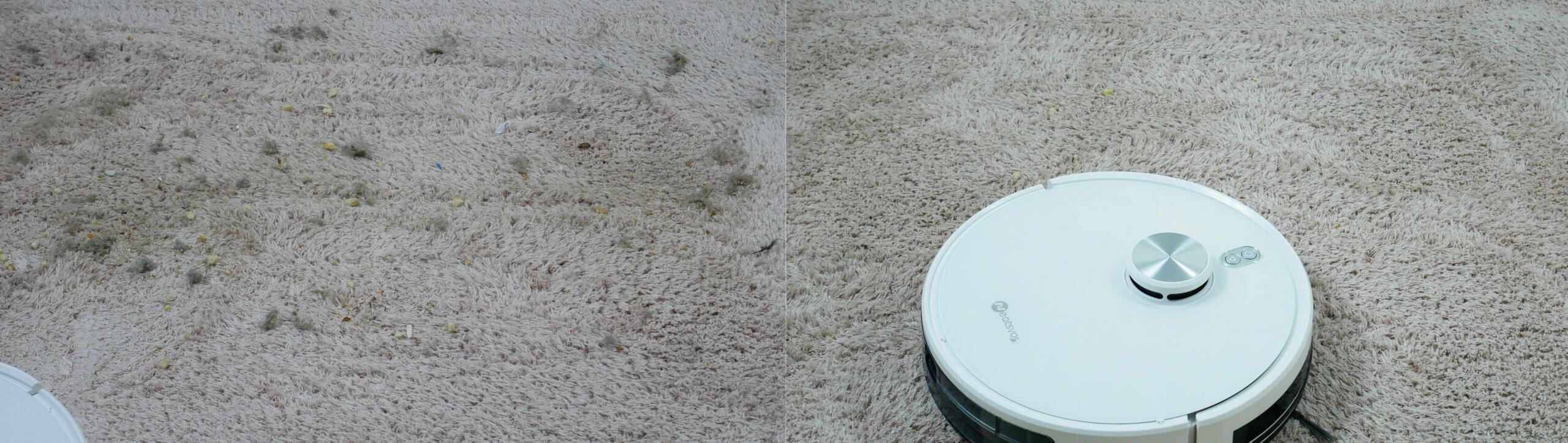 Tos pačios šiukšlės buvo išbarstytos ant kilimo. „NEATSVOR S600“ surinko didžiąją dalį šiukšlių, palikdamas nedidelį kiekį džiūvėsėlių, kurie susipainiojo krūvoje. Kilimų valymo našumas buvo vidutinis. Jei centrinis šepečio blokas būtų turėjęs plaukiojantį šepetį, manau, rezultatai būtų buvę geresni.