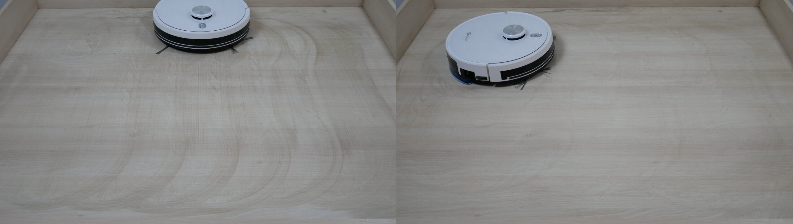 Laminuotų grindų cheminis valymas yra geras. Robotas dulkių siurblys sugebėjo surinkti nuo grindų didžiąją dalį šiukšlių. Tai apėmė ne tik smulkias buitines šiukšles, bet ir naminių gyvūnėlių plaukus bei plaukus. Kampuose liko tik nedidelis kiekis šiukšlių, kur beveik visi rinkoje esantys apvalūs robotai nesugeba efektyviai išvalyti. Šiek tiek naminių gyvūnėlių plaukų ir plaukų pateko į centrinį šepetį. Didžioji dalis šiukšlių pateko į dulkių konteinerį. Bandymas sėkmingai išlaikytas!