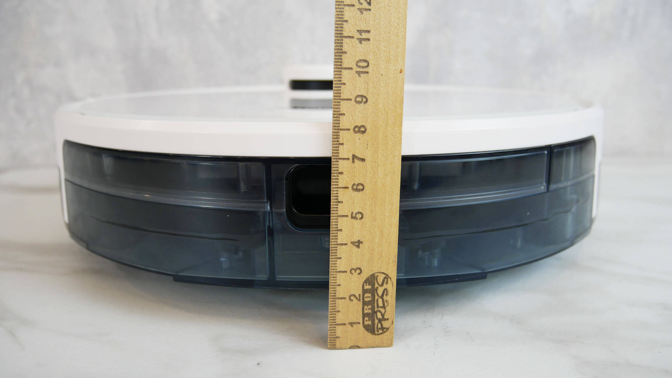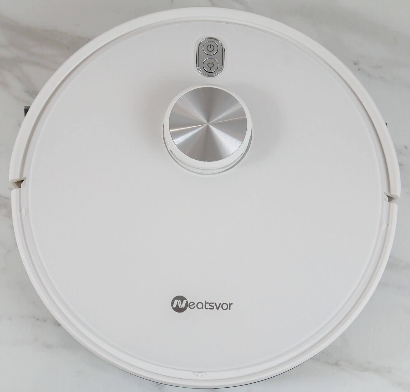 Dabar pažvelkime į NEATSVOR S600 dizainą. Pradėkime nuo paties roboto. Jis apvalus ir baltos spalvos. Korpusas yra maždaug 10 cm aukštyje nuo grindų.