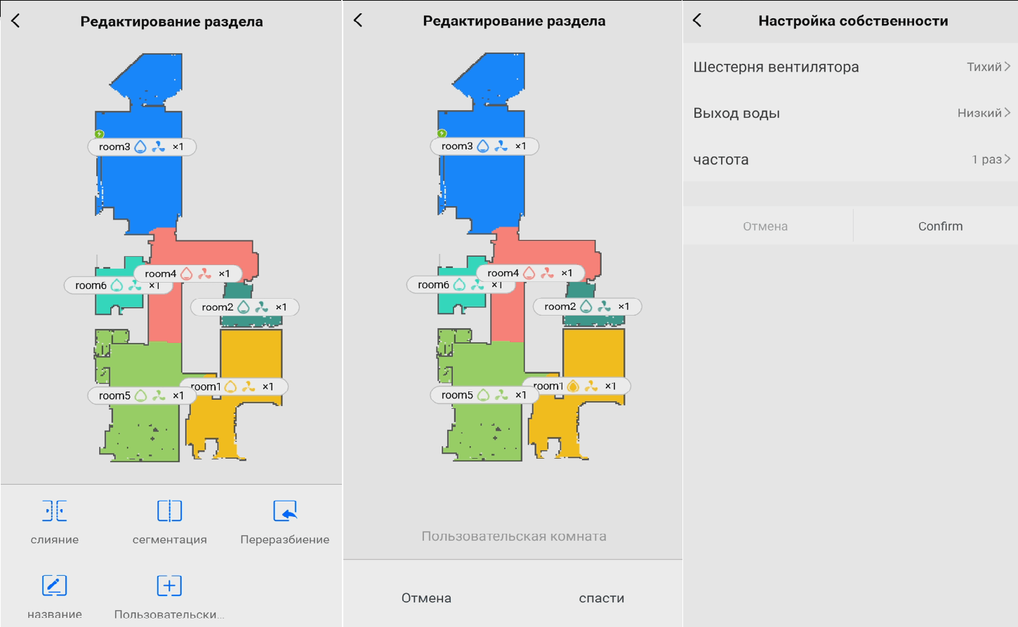 Žemėlapio redaktoriuje galite rankiniu būdu redaguoti kambarių ribas, suteikti jiems pavadinimus ir nustatyti pasirinktinį režimą. Šiame režime galite individualiai reguliuoti siurbimo galią, vandens srauto lygį ir roboto praėjimų skaičių (vieną arba du) kiekvienam kambariui.