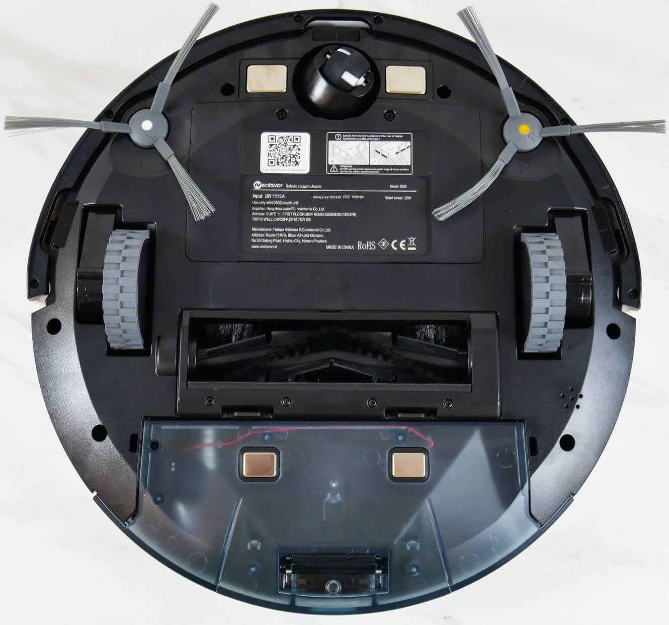 Roboto apačioje yra trys apsaugos nuo kritimo jutikliai. Nešvarumus surenka du šoniniai ir centrinis šepečiai. Turbo šepetys turi šerelius ir žiedlapius, o vieną pusę galima nuimti, kad būtų pašalinti susivėlusius plaukus ir kailį. Centrinis šepečio blokas neplūduriuoja. Taip pat svarbu atkreipti dėmesį, kad NEATSVOR S600 nėra savaiminio valymosi įrenginys, kai sumontuotas vandens bakas. Jis įkraunamas tik įkrovimo stotelėje.