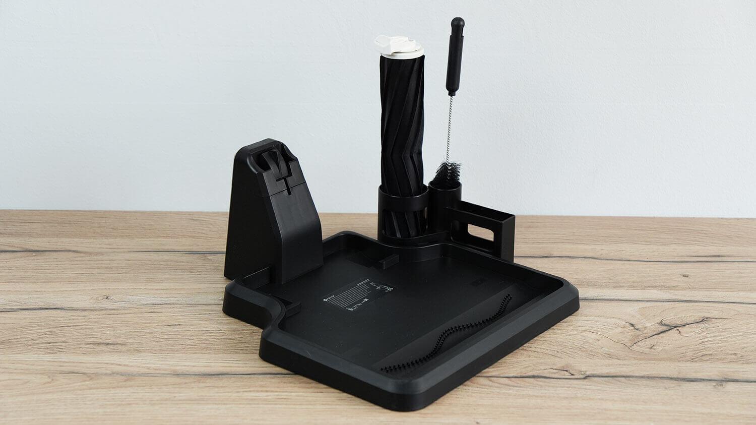 Kalbant apie pagrindą, dulkių siurblys ant jo tik įkraunamas ir savaime išsivalo. Volelio išdžiovinti nėra galimybės.