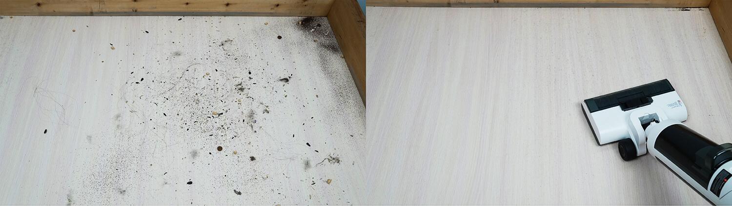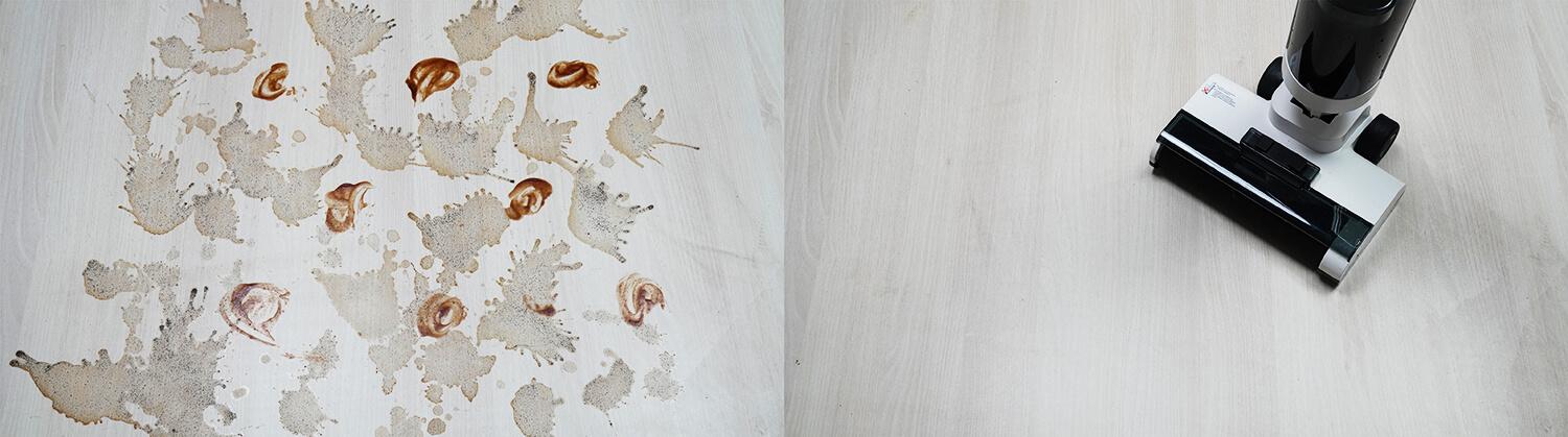 Drėgno/sauso valymo dulkių siurblys taip pat pademonstravo savo gebėjimą ne tik kruopščiai išvalyti grindis, bet ir surinkti išsiliejusius skysčius bei sudėtingus mišinius. Bandymo metu su žalių kiaušinių ir miltų mišiniu paviršius išliko švarus, be dryžių.
