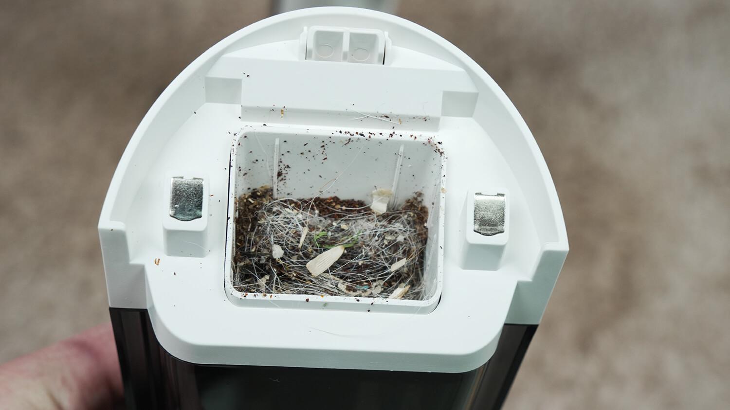 Po bandymo patikrinau pūkelių surinktuvo savaiminio išsivalymo efektyvumą. Matome, kad jis taip pat nešvarus. Po savaiminio išsivalymo pūkeliai atrodė geriau, bet nebuvo idealiai švarūs, o kai kurie plaukai liko susivėlę.
