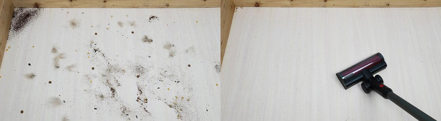 Dabar patikrinkime, kaip gerai „Roborock Dyad Pro Combo“ surenka šiukšles nuo grindų. Ant laminuotų grindų išbarsčiau įvairių rūšių šiukšles: plaukus, kailį, grūdus ir kitas smulkias buitines šiukšles. Šis prietaisas veikė gerai. Vienintelis dalykas, kurį pastebėjau, buvo akloji zona kampuose. Volelis beveik nesurenka plaukų ar kailio. Visos šiukšlės buvo surinktos dulkių konteineryje.