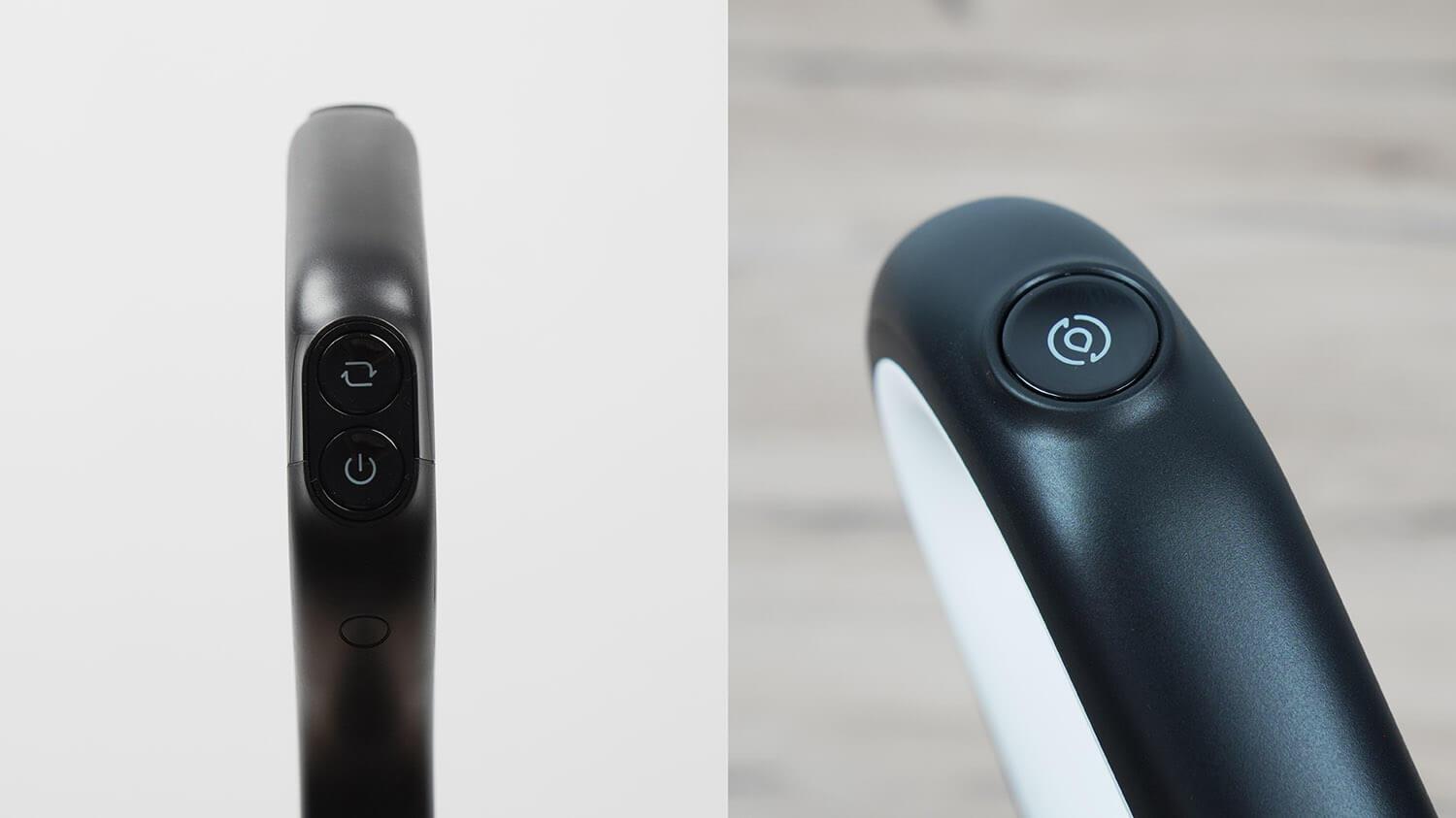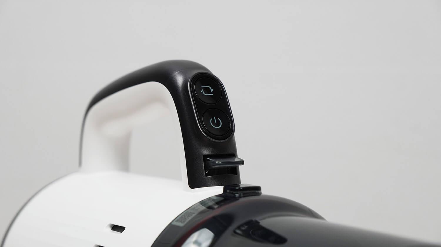 Rankinis dulkių siurblys turi du valdymo mygtukus: įjungimo / išjungimo ir automatinio bei maksimalaus veikimo režimų perjungimo.
