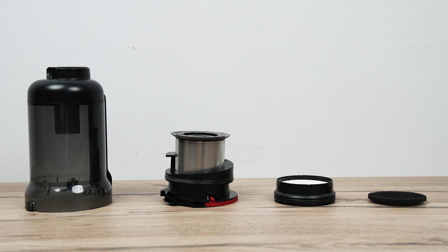 Kalbant apie dulkių surinktuvą, jo filtravimo sistemą sudaro HEPA filtras, putplasčio filtras ir cikloninis filtras su tinkleliu. Dulkių surinktuvo talpa yra 465 ml.