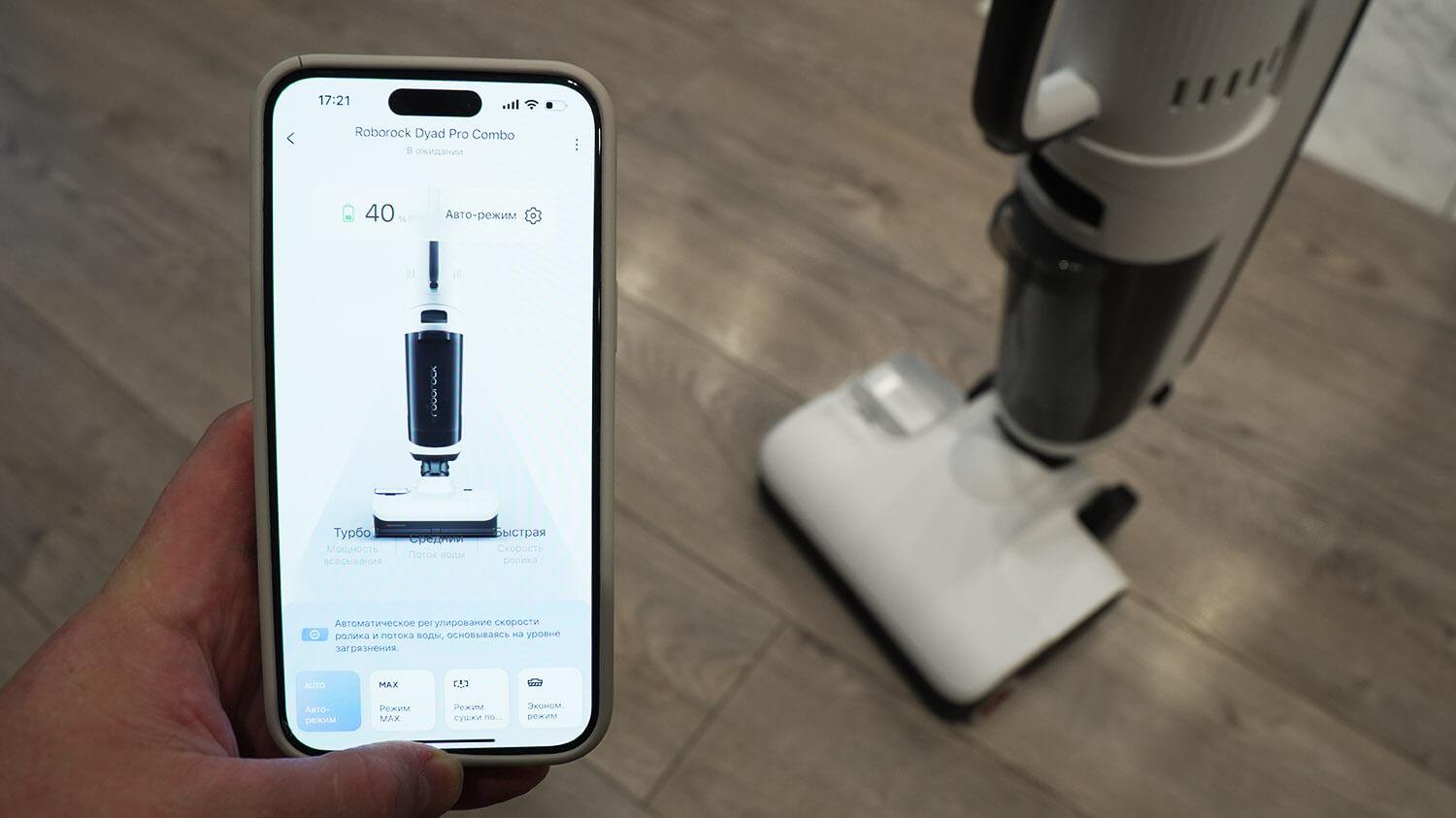 Norėčiau pabrėžti „Roborock Dyad Pro Combo“ savybes. Šis vertikalus dulkių siurblys valdomas naudojant patentuotą mobiliąją programėlę. Ji leidžia lanksčiai pritaikyti valymo parametrus. Pavyzdžiui, galite pasirinkti vieną iš keturių veikimo režimų ir reguliuoti automatinio režimo parametrus (pvz., siurbimo galią, vandens srautą į volelius, volelių greitį ir ploviklio kiekį). Taip pat galite pasirinkti vieną iš savaiminio valymo režimų, reguliuoti volelių džiovinimo laiką ant pagrindo, suplanuoti volelių džiovinimą ir netgi stebėti eksploatacinių medžiagų būseną.