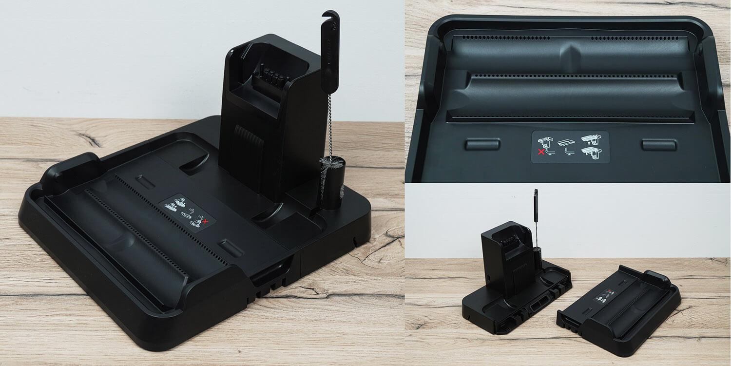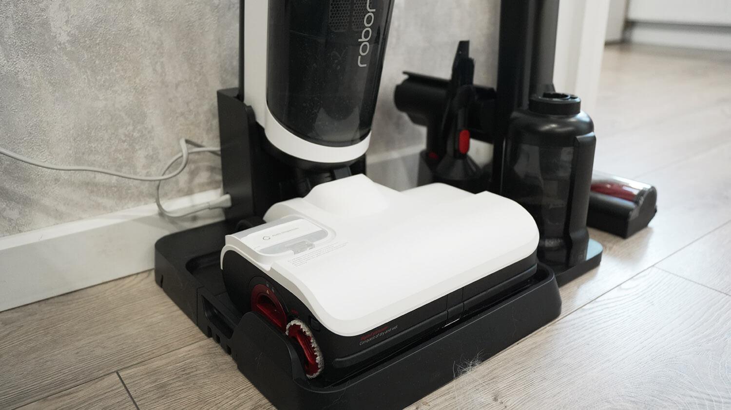 Paskutinis dalykas, į kurį reikia atsižvelgti, yra pagrindas. Čia „Roborock Dyad Pro Combo“ įkrauna, pats išsivalo ir šiltu oru išdžiovina volelius.