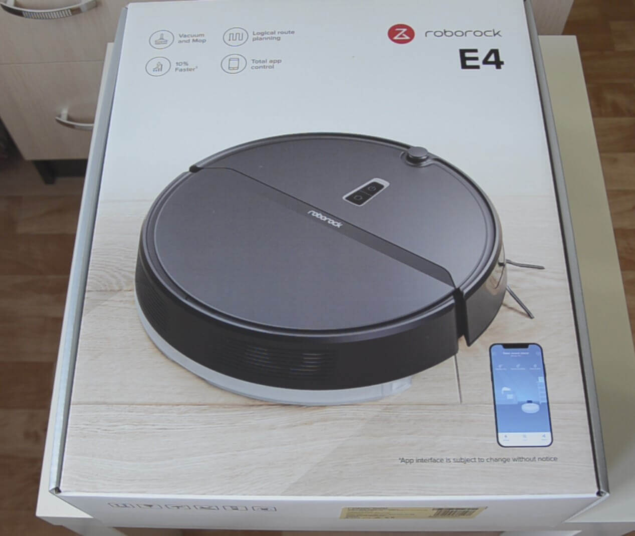Pradėkime nuo pakuotės. Robotas dulkių siurblys parduodamas firminėje dėžutėje su trumpa informacija apie modelį. Nuotraukoje iš karto matyti, kad apačioje sumontuotas šlapio valymo antgalis, todėl modelis tinka ir grindų plovimui. Taip pat palaikomas valdymas programėle. Dėžutėje nurodyta, kad „Roborock E4“ valo 10 % greičiau nei anksčiau išleisti biudžetiniai šios linijos modeliai. Robotas dulkių siurblys juda gyvatės principu, todėl yra ir navigacijos funkcija.