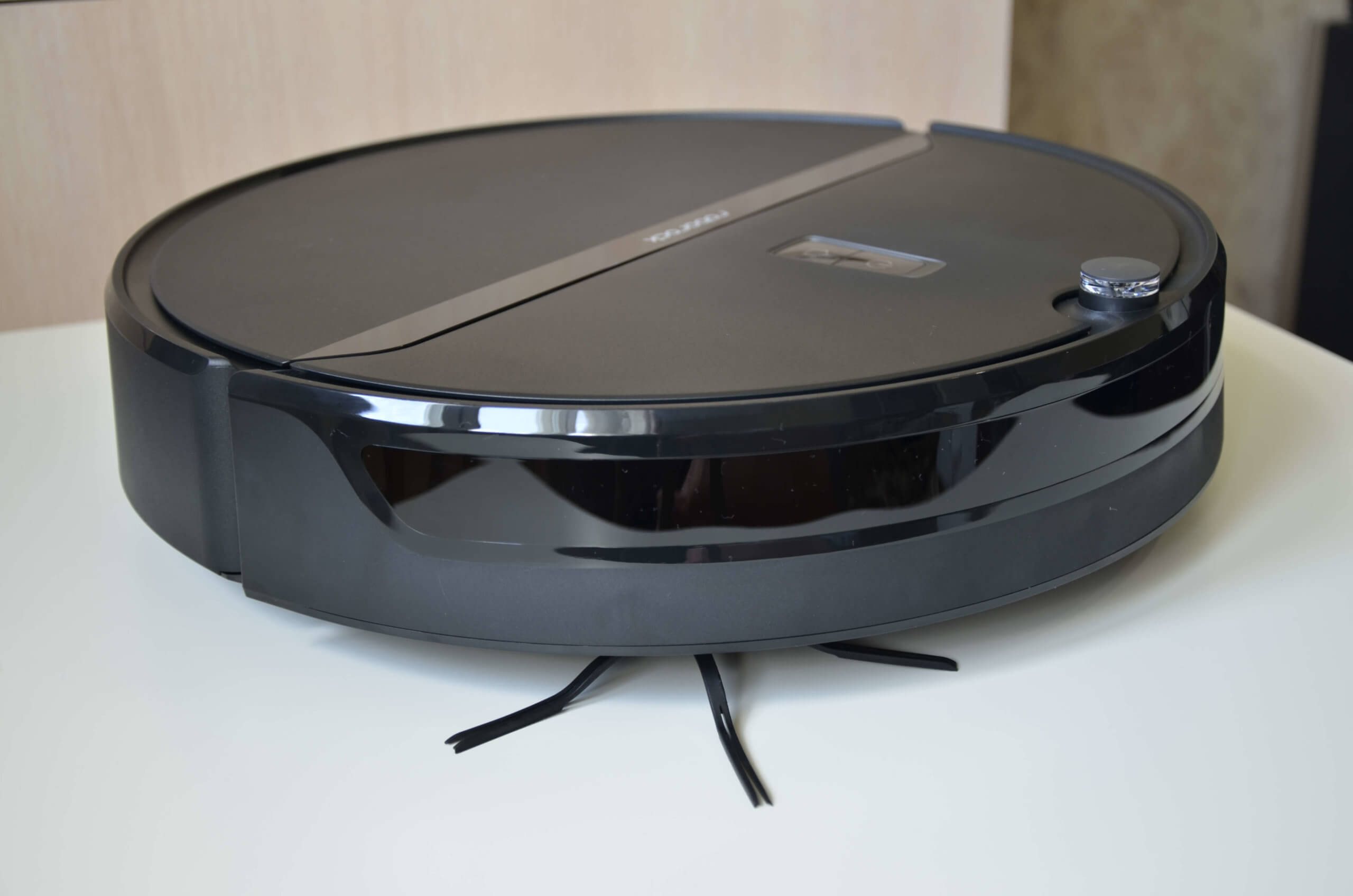 Po plėvele matome blizgią juodą juostelę su įmonės logotipu. Virš jos yra maitinimo mygtukas ir grįžimo į bazę mygtukas. Nėra kameros ar lidaro; robotas naviguoja naudodamas giroskopą ir kitus jutiklius.