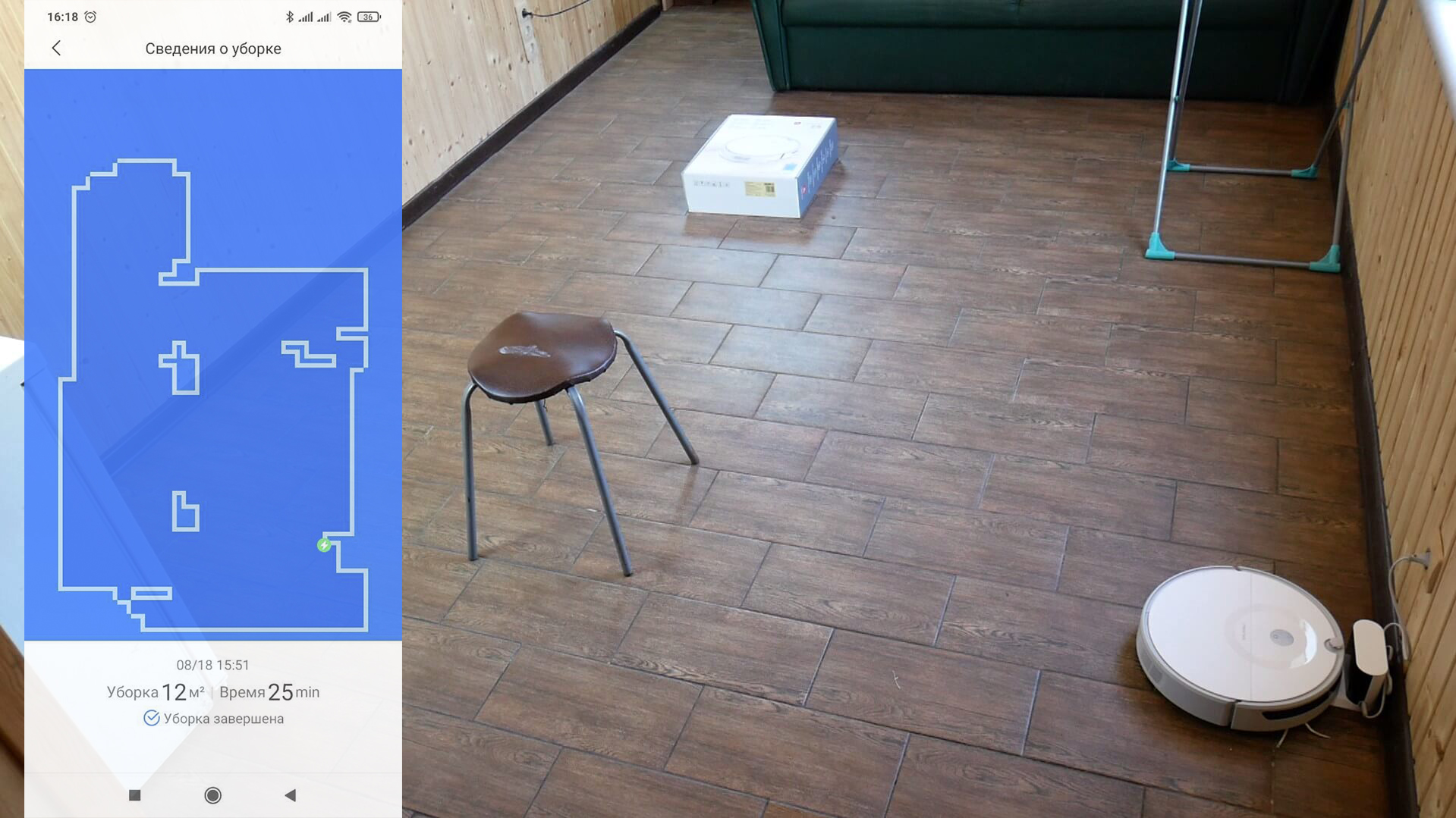 Kalbant apie navigaciją namo viduje, robotas taip pat kerta visą prieinamą plotą, pirmiausia zigzago raštu, o tada palei perimetrą. Neliko neišvalytų vietų, o 34 kvadratinių metrų valymas užtruko 49 minutes, o robotas, įskaitant perimetro kirtimą, tai buvo 43 kvadratiniai metrai. Tai gana standartinis robotinių dulkių siurblių su giroskopu našumas. Bandymas buvo sėkmingas!