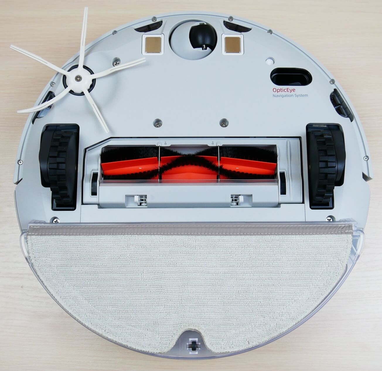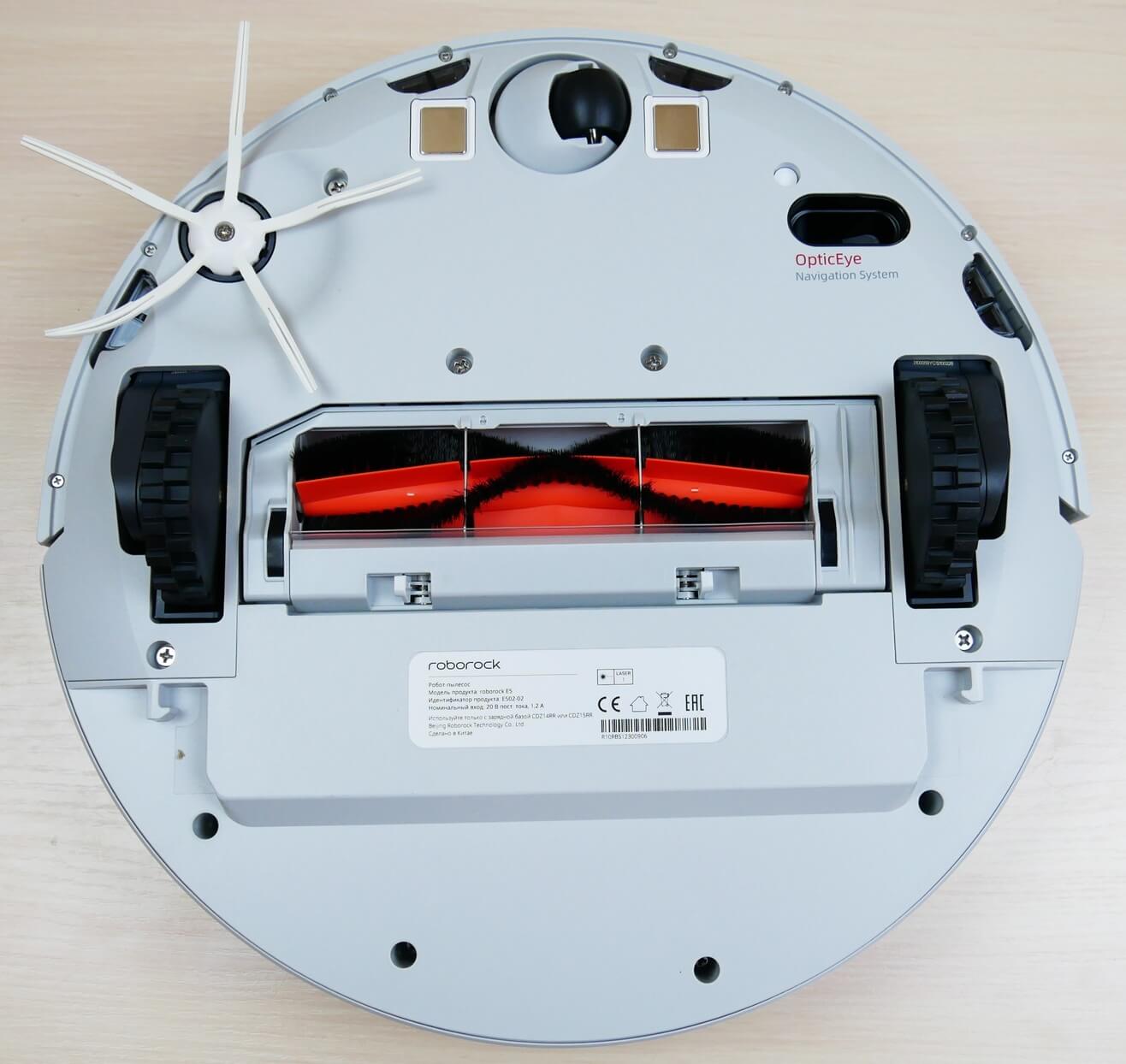 Pažvelkime į „Roborock E5“ apačią. Joje yra keturi apsaugos nuo kritimo jutikliai, taip pat papildoma navigacijos sistema – optinis jutiklis „OpticEye“, leidžianti robotui tiksliau orientuotis.