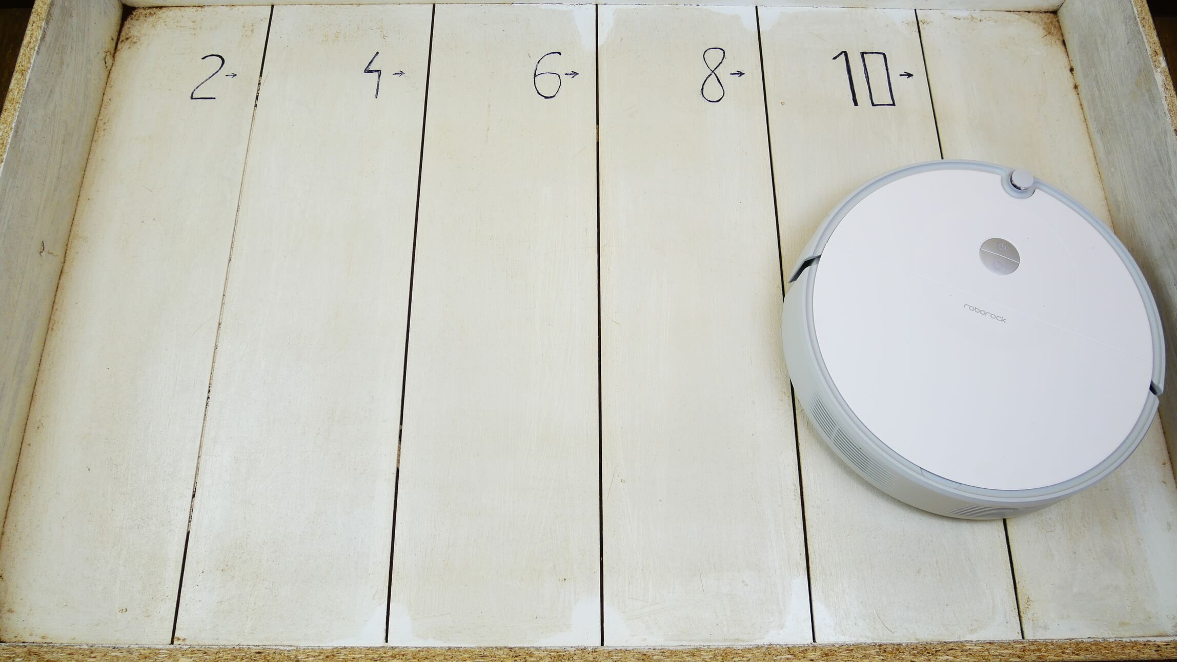 Iš naujo paleidęs valymo procesą, robotas tęsė savo ciklą, apšlavė dėžę ir kelias kėdžių kojas ir grįžo į savo bazę. Apskritai „Roborock E5“ navigacija yra gana gera, atsižvelgiant į tai, kad jis neturi kameros ar lidaro, tačiau yra keletas nedidelių lygiavimo problemų, už kurias atimsiu vieną tašką.