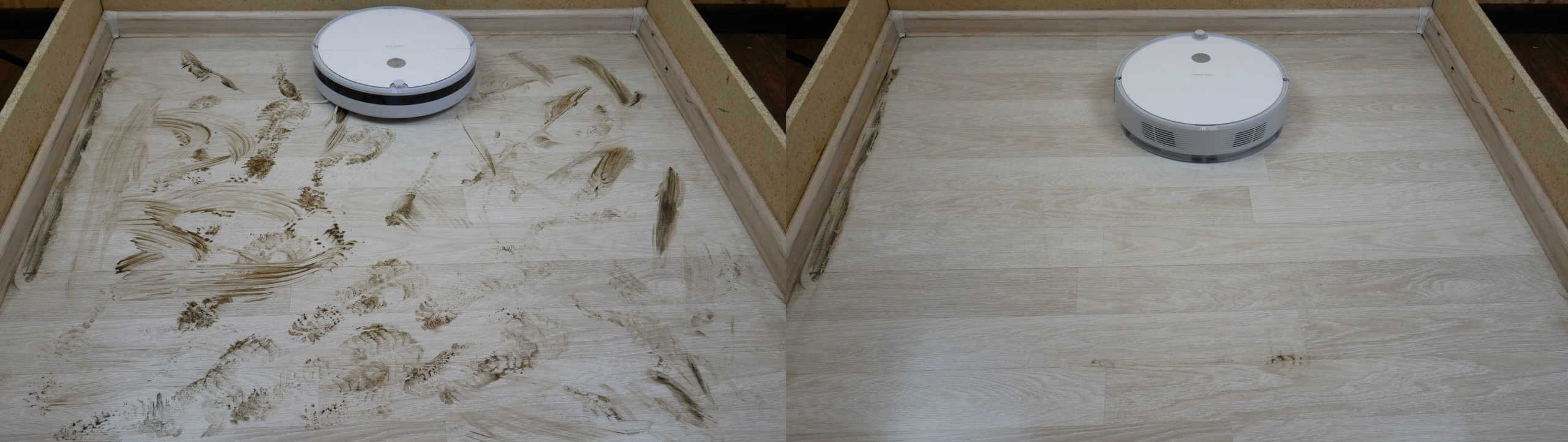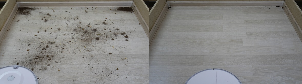 Dėl cheminio valymo našumo nusiskundimų nebuvo; robotas sugebėjo surinkti visas šiukšles nuo grindų, įskaitant augintinių plaukus ir plaukus. Neišvalytos buvo tik kampai, kur apvalūs robotiniai dulkių siurbliai negali sušluoti šiukšlių. Didžioji dalis šiukšlių susirinko dulkių konteineryje, o centrinis šepetys sugavo dalį plaukų. Bandymas buvo sėkmingas!