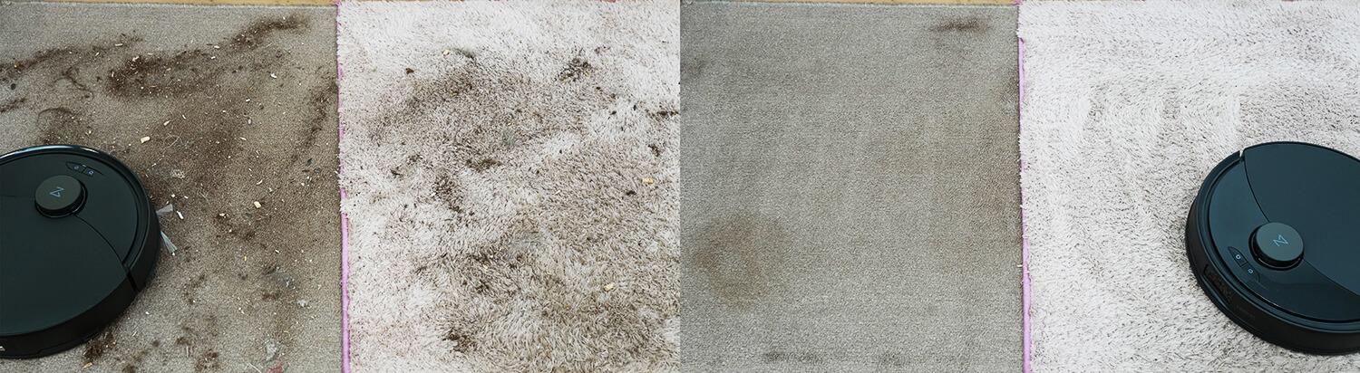 Robotas gali kruopščiai išvalyti trumpo ir vidutinio plauko kilimus. Puikūs rezultatai, iš dalies dėl padidintos siurbimo galios.