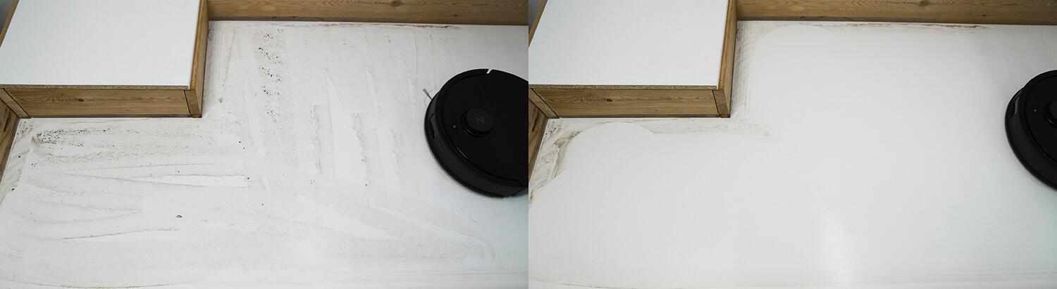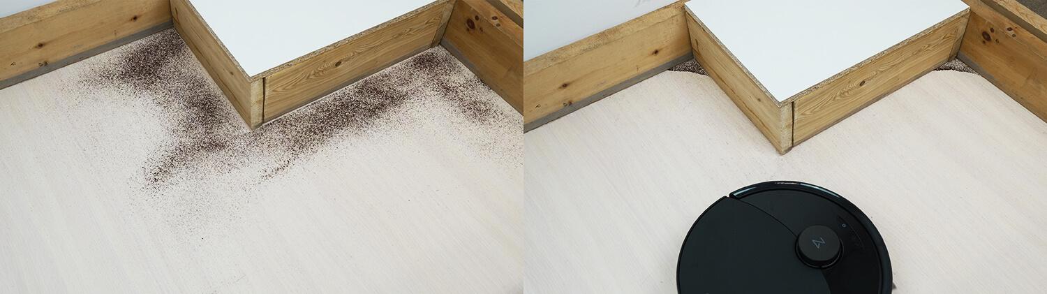 Kalbant apie įvairių tekstūrų šiukšlių surinkimo nuo laminuotų grindų kokybę, ji yra gera. Robotas dulkių siurblys gali lengvai surinkti net dideles šiukšles nuo grindų. Šiek tiek šiukšlių lieka vidiniuose kampuose, kur apvalūs robotai dulkių siurbliai nepasiekia. Tačiau jis gerai išvalo išorinius kampus, o tai yra privalumas.