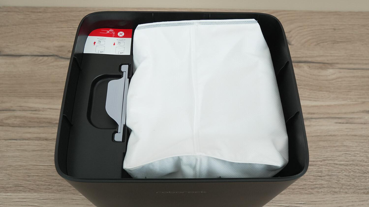 Dulkių surinktuvo savaiminio valymo stotelė yra pažįstamo dizaino. Įkrovimo gnybtai ir atliekų latakas yra apačioje. Atliekų maišas yra po dangčiu viršuje.