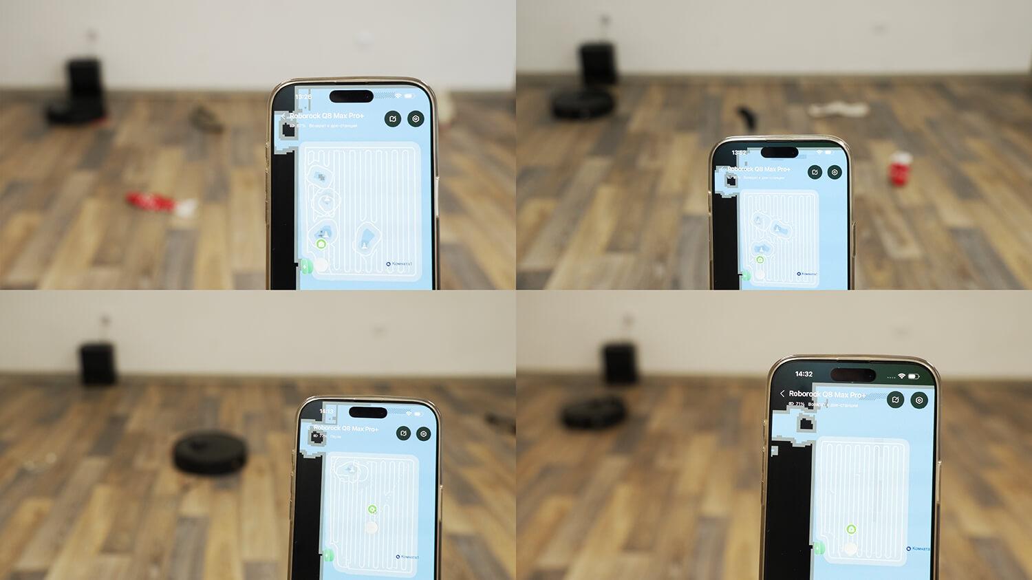 Ir galiausiai, pereikime prie bandymų! Pirmiausia išbandysime „Roborock Q8 Max Pro Plus“ navigaciją kambaryje su kliūtimis. Išėjęs iš stotelės, robotas-dulkių siurblys pirmiausia apėjo kambario perimetrą. Veidrodis netrukdė žemėlapiui. Džiovyklės kojelės kėlė iššūkį: robotas perbėgo per vieną koją, trumpam užstrigo ant kitos ir apsuko ją ratu. Vėliau jis zigzago raštu išvalė visą turimą plotą. Jis taip pat išvalė aplink dėžę ir stalo kojų išorę, bet nevalė kojų vidinės pusės ir grįžo prie pagrindo. Apskritai nieko kritiško.