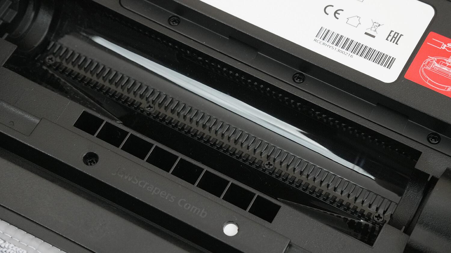 Kalbant apie valymo modulio būklę, matome, kad šoninis šepetys švarus dėl atnaujinto dviejų sijų dizaino, tačiau centrinis šepetys susivėlė plaukų ir kailio. Šukos už šepečio jo neišgelbėjo.