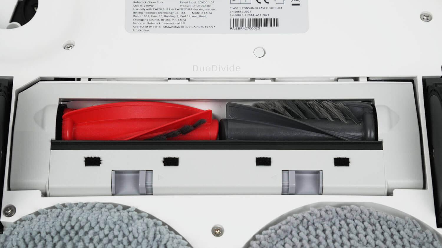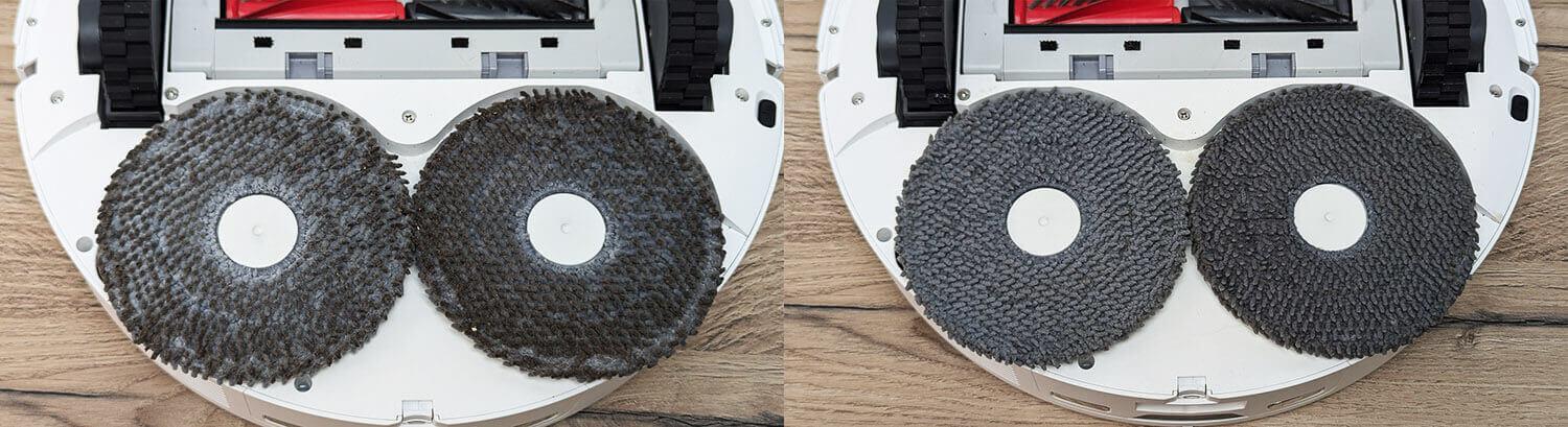 Valymo pagalvėlės yra apvalios, kaip ir kitų „Qrevo“ linijos robotų. Už dešiniojo laikiklio matote mechanizmą, kuris praplečia pagalvėlę iki korpuso krašto. Tai pašalina akląją zoną tarp pagalvėlės krašto ir grindjuostės, todėl robotas gali geriau valyti palei sienas ir baldus.