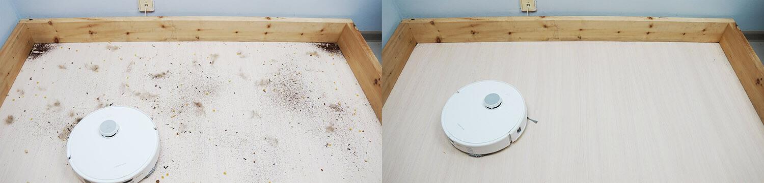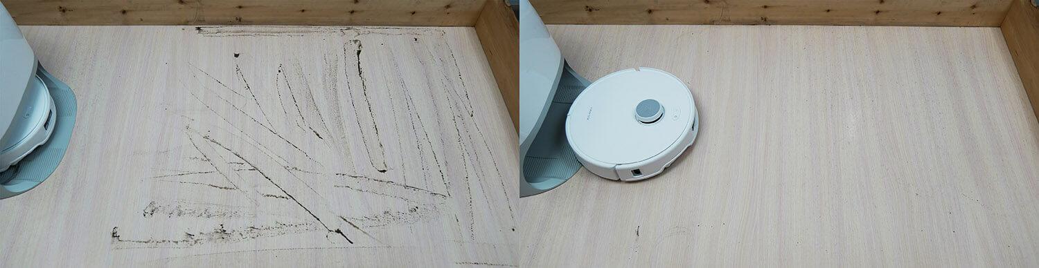 Įvairių tipų šiukšlių surinkimo našumas nuo laminuotų grindų yra geras, tačiau yra vienas trūkumas. Net kampuose robotas dulkių siurblys valo geriau nei kiti serijos modeliai, kurie taip pat turi ištraukiamą šoninį šepetį. Vėlgi, prie to greičiausiai prisidėjo naujas šoninio šepečio dizainas. Visas stovas yra visiškai švarus!