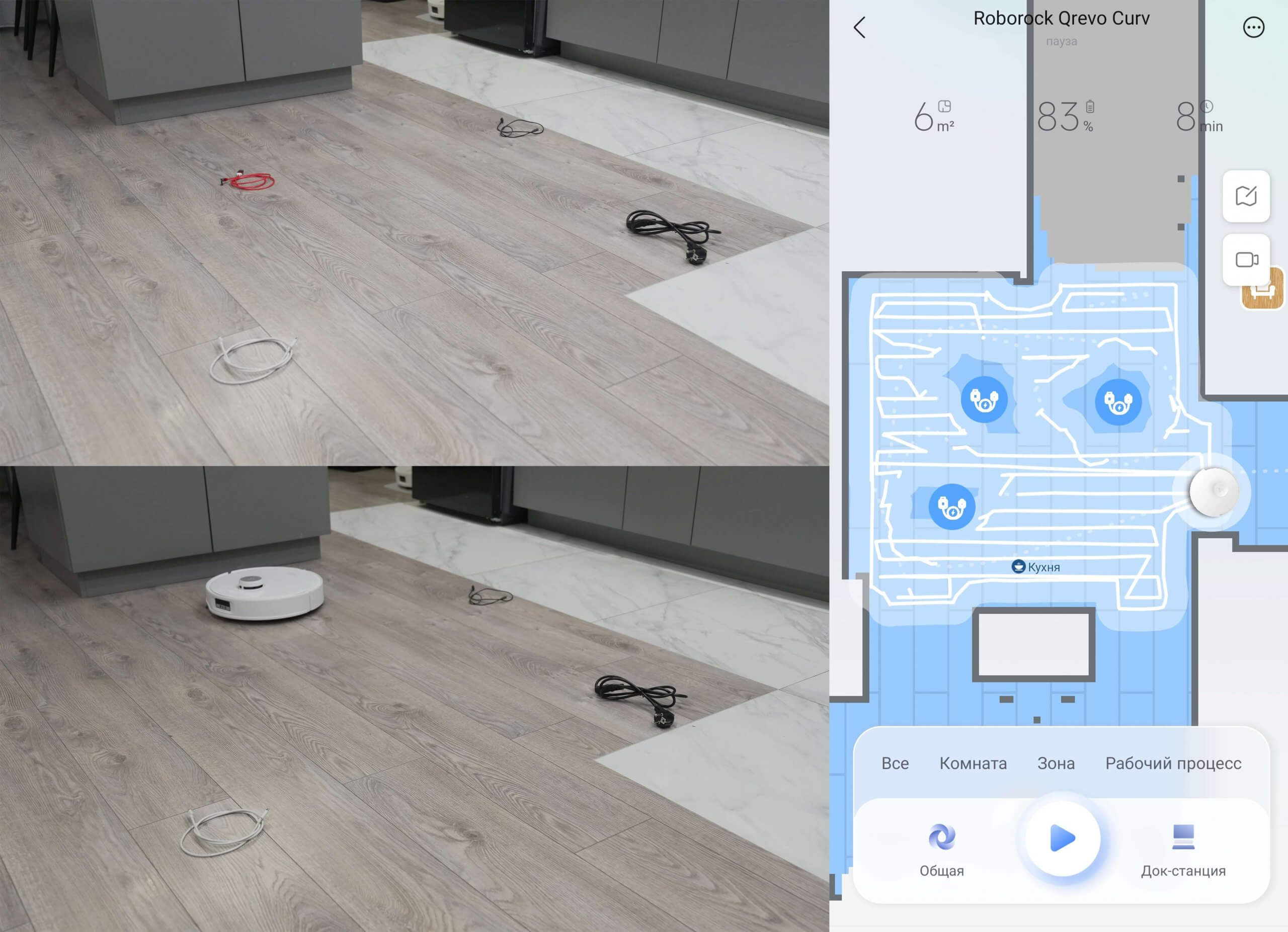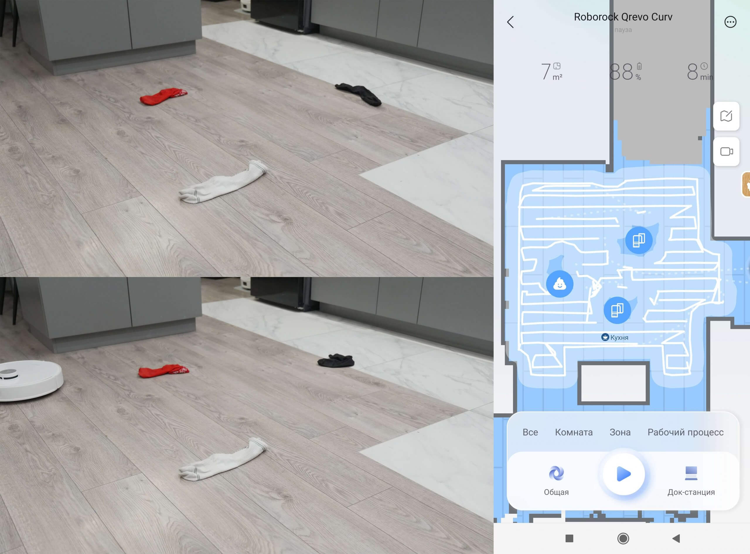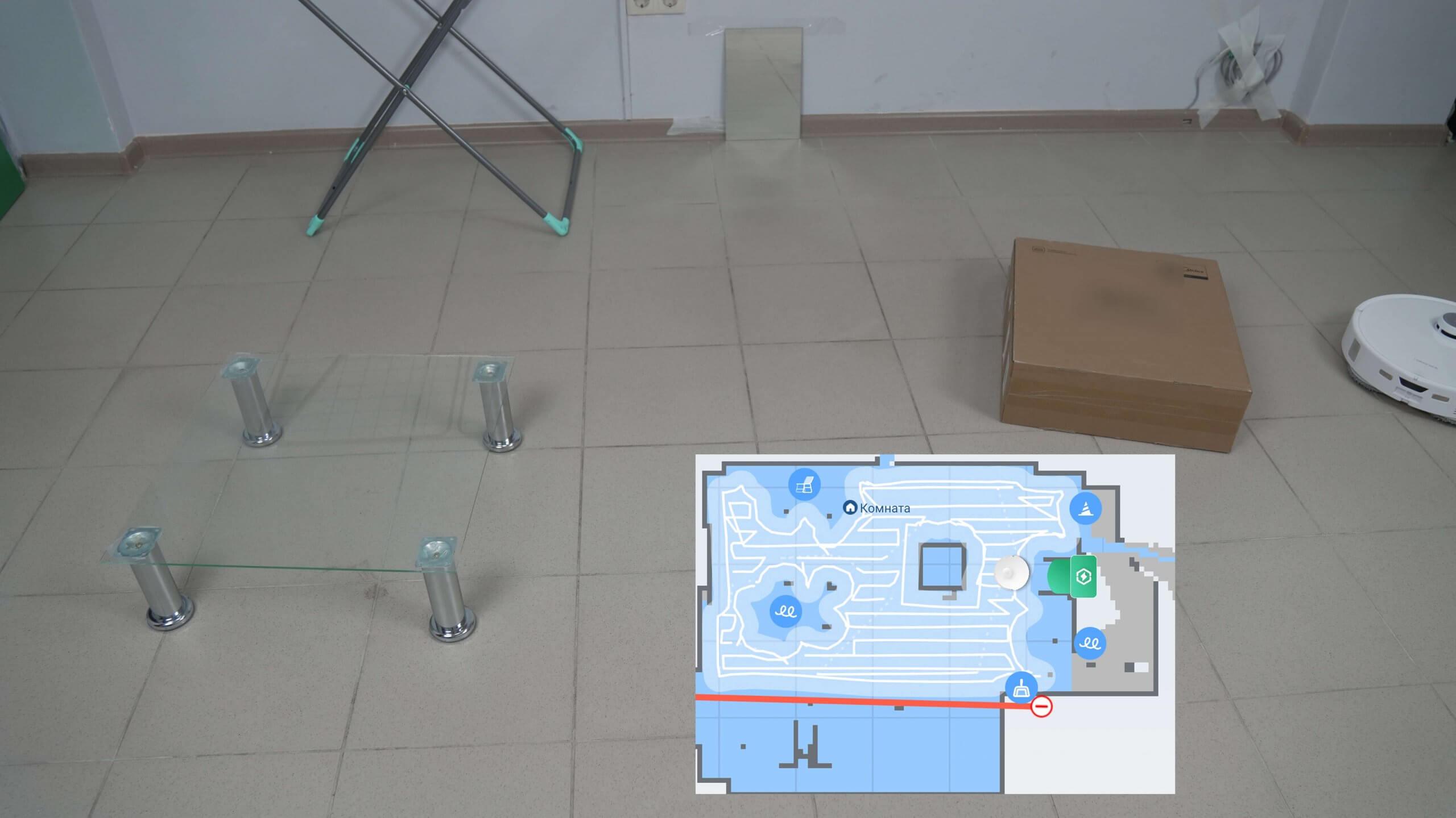 Galiausiai pereikime prie bandymų! Pirmiausia išbandysime „Roborock Qrevo Curv“ navigaciją kambaryje su kliūtimis. Robotas dulkių siurblys pirmiausia apeina kambario perimetrą, tada serpantininiu būdu išvalo visą prieinamą plotą. „Lidar“ sukūrė netikrą kambarį už veidrodžio – tai problema, būdinga visiems „lidar“ robotams. Džiovyklės kojos nesukėlė jokių problemų. Ji taip pat atskirai išvalė dėžę ir kėdės kojas, o tada grįžo į stotelę. Bandymas buvo sėkmingas.