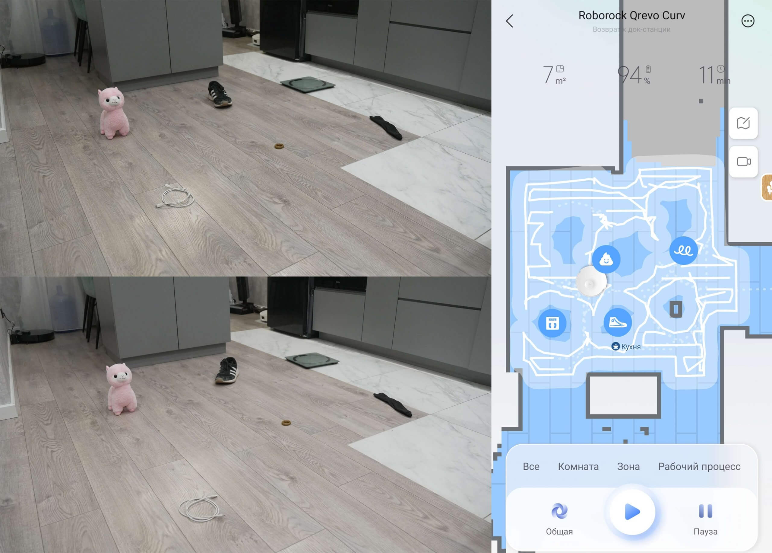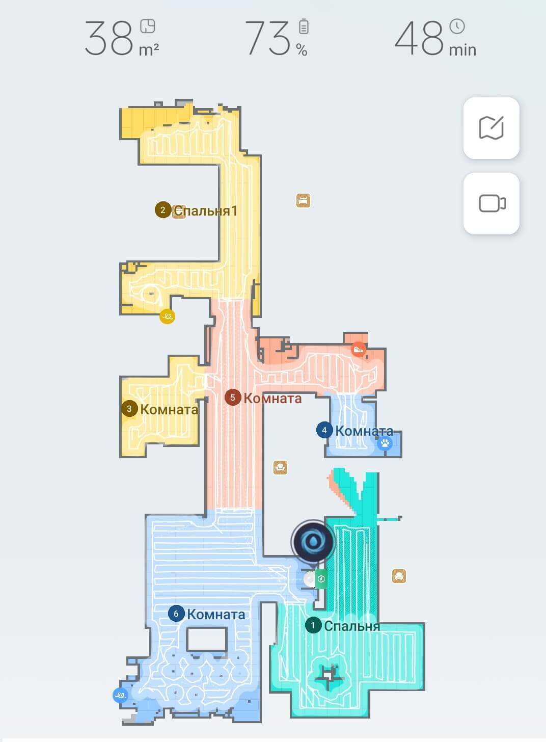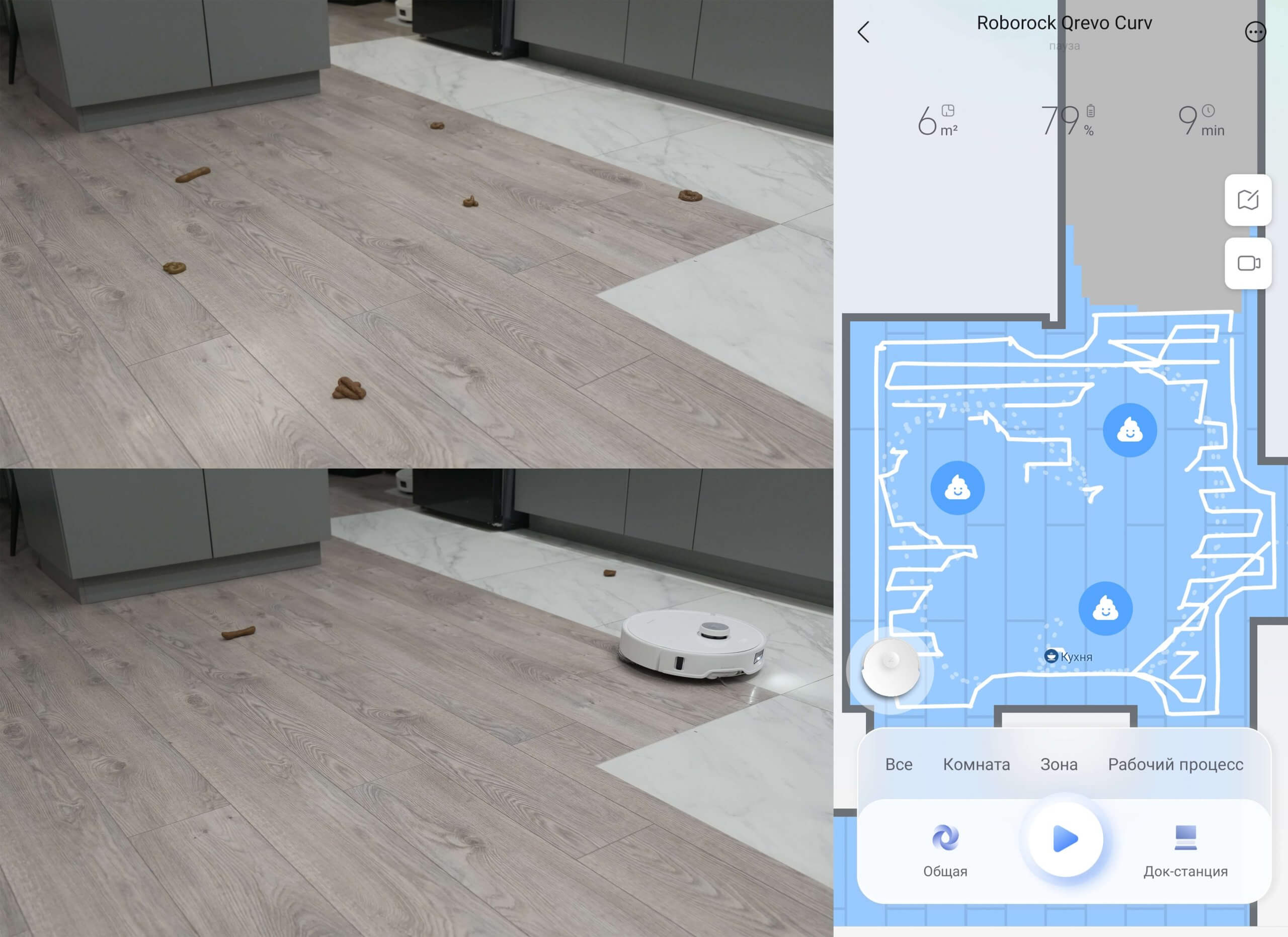 Galiausiai pereikime prie bandymų! Pirmiausia išbandysime „Roborock Qrevo Curv“ navigaciją kambaryje su kliūtimis. Robotas dulkių siurblys pirmiausia apeina kambario perimetrą, tada serpantininiu būdu išvalo visą prieinamą plotą. „Lidar“ sukūrė netikrą kambarį už veidrodžio – tai problema, būdinga visiems „lidar“ robotams. Džiovyklės kojos nesukėlė jokių problemų. Ji taip pat atskirai išvalė dėžę ir kėdės kojas, o tada grįžo į stotelę. Bandymas buvo sėkmingas.