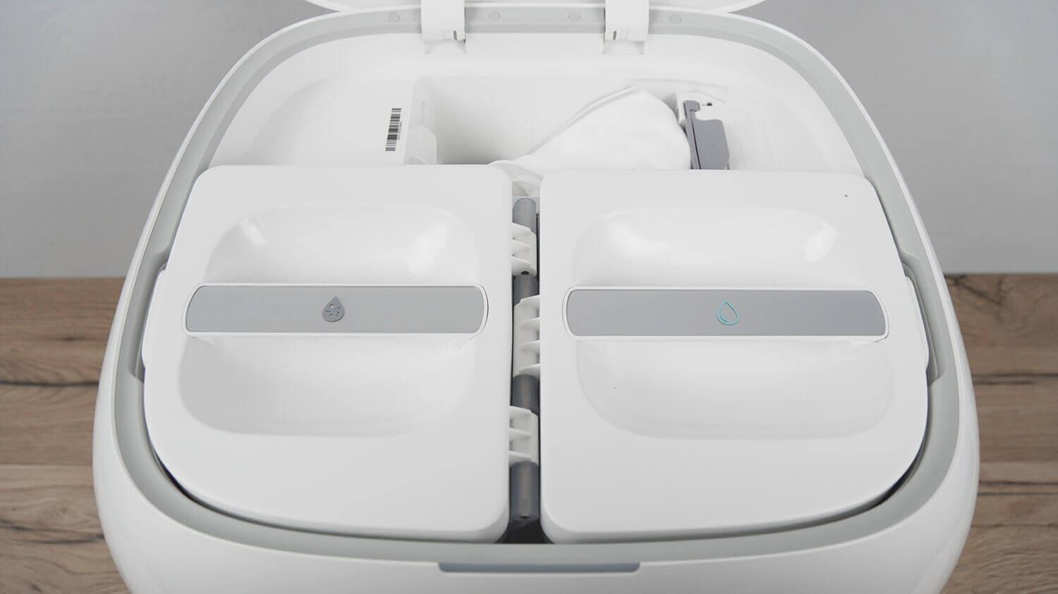 Kiekvieno bako talpa yra 4 litrai. Švaraus vandens bako viduje įrengtas dezinfekavimo modulis. Atliekų maišas yra standartinė komplektacija. Deja, nėra automatinio ploviklio dozatoriaus.