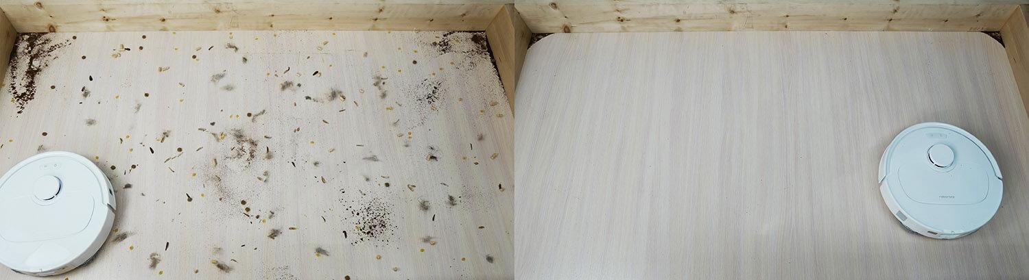 Įvairių rūšių šiukšlių surinkimo kokybė nuo laminuotų grindų yra gera. Kampuose, kur nepasiekia apvalūs robotiniai dulkių siurbliai, lieka tik šiek tiek šiukšlių. Visos šiukšlės surenkamos į dulkių konteinerį. Svarbu atkreipti dėmesį, kad centrinis šepetys nesusipainiojo plaukais. Plaukai susipainiojo tik aplink šoninį šepetį. Tai privalumas!