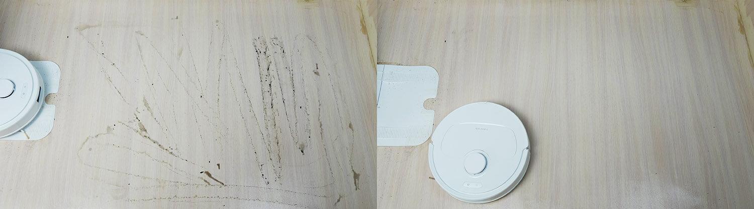 Taip pat išbandėme servetėlių valymo efektyvumą po nešvarumų testų. Po testų jos sugėrė visus nešvarumus. Paleidome skalavimo ciklą, palaukėme ir stebėjome. Vizualiai servetėlės buvo daug švaresnės. Bet ne idealiai švarios. Iš patirties galiu pasakyti, kad valymo rezultatai geri, ne prastesni nei panašių produktų. Kasdien naudojant, išplovus grindis, servetėlės gerai nuplaunamos stotelėje. Šilto vandens slėgiu pašalinamas minimalus nešvarumų kiekis. Tai yra pliusas. Dėl servetėlių valymo efektyvumo nusiskundimų nėra.