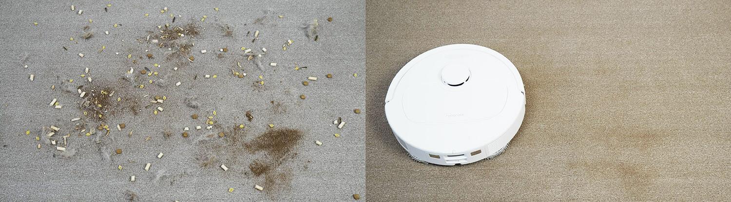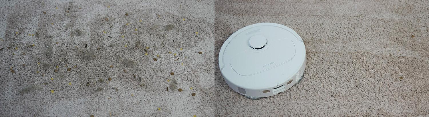 Tos pačios šiukšlės buvo išbarstytos ant trumpo plauko kilimo. Ir galiu pasakyti, kad „Roborock Qrevo S“ kruopščiai išvalė kilimą.