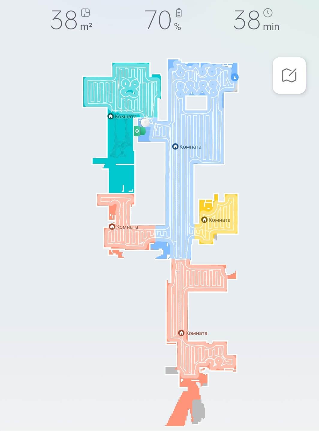 Kalbant apie navigaciją namuose, „Roborock Qrevo S“ valo kambarį po kambario, pirmiausia palei perimetrą, o tada vingiuotu būdu. Kas 15 minučių, kaip nurodyta nustatymuose, robotas dulkių siurblys grįžta į stotelę ir išskalauja valymo šluostę, tada grįžta valyti ten, kur baigė. Nėra neišvalytų vietų, valymo greitis didelis, o šio modelio navigacija puiki!