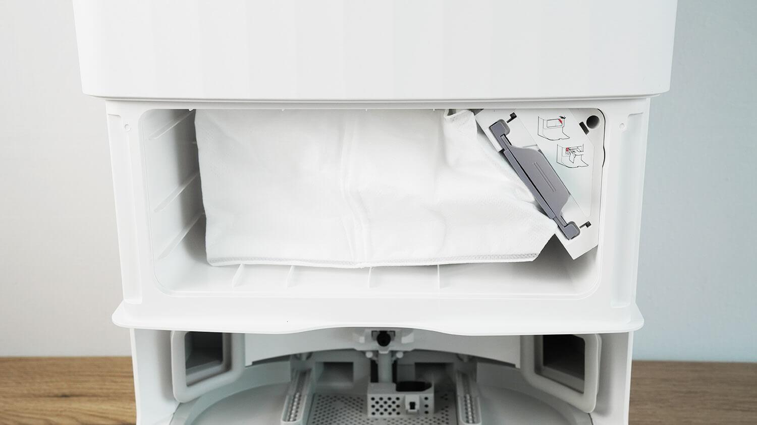 Atliekų maišas yra priekyje, už dangčio. Maišo talpa – 2,7 litro.