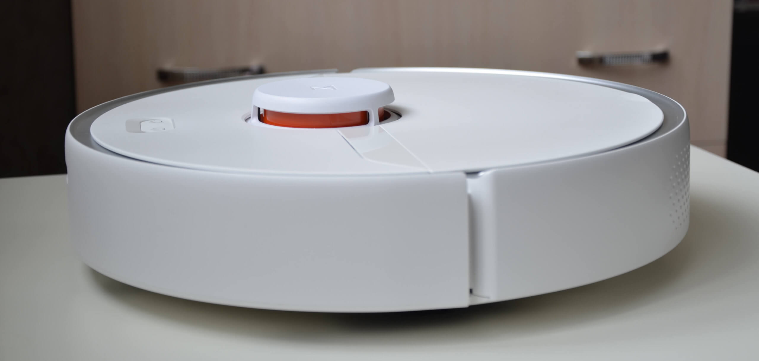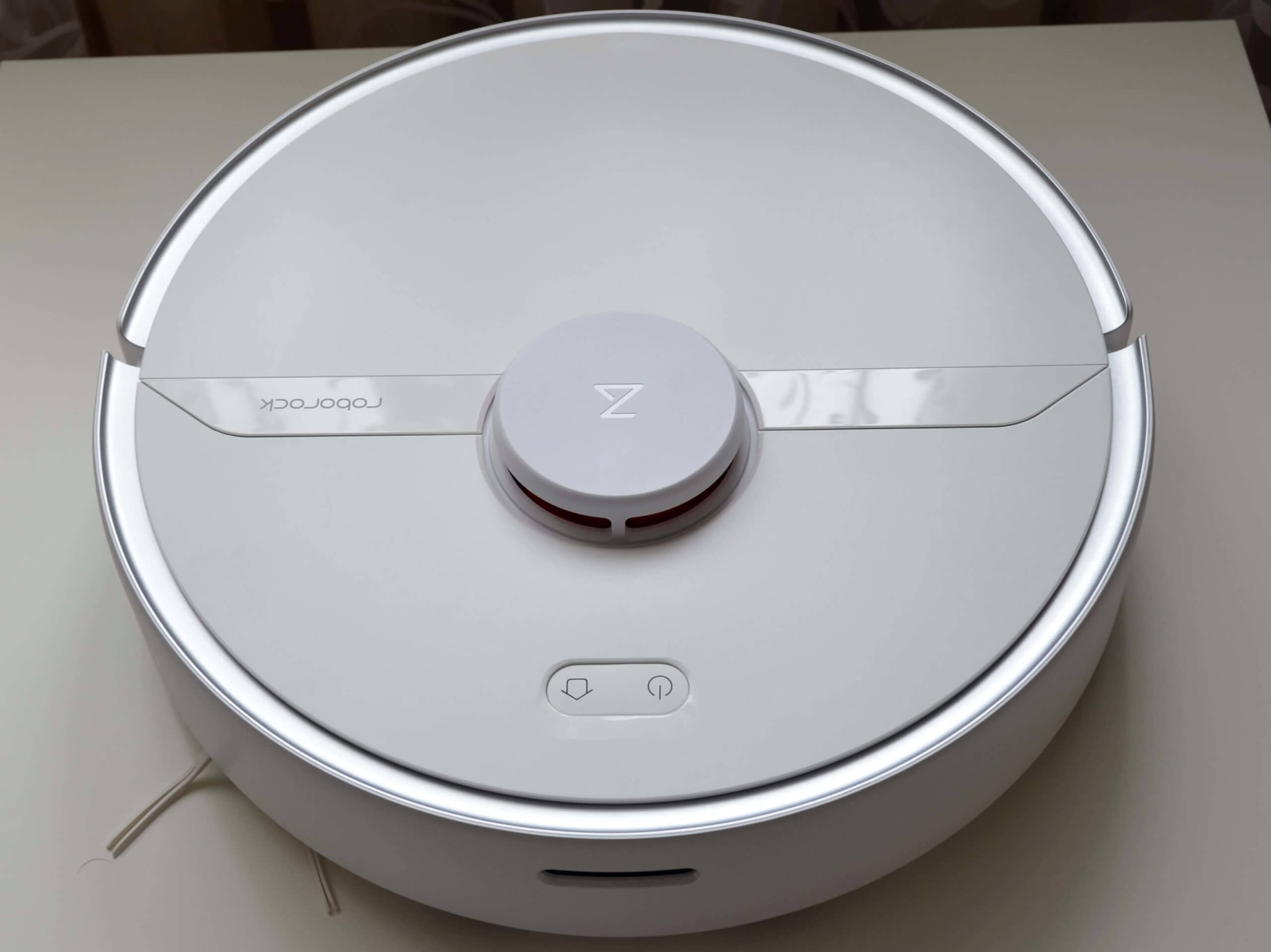 Pereikime prie paties roboto dulkių siurblio. Viršuje matome lidarą, kuris atsakingas už navigaciją ir kambario žemėlapių sudarymą. Pats lazerinis atstumo ieškiklis turi mygtuką viršuje, kuris neleidžia robotui užstrigti. Paspaudus mygtuką, robotas keičia kryptį. Be lidaro, korpuso viršuje yra du mechaniniai valdymo mygtukai.