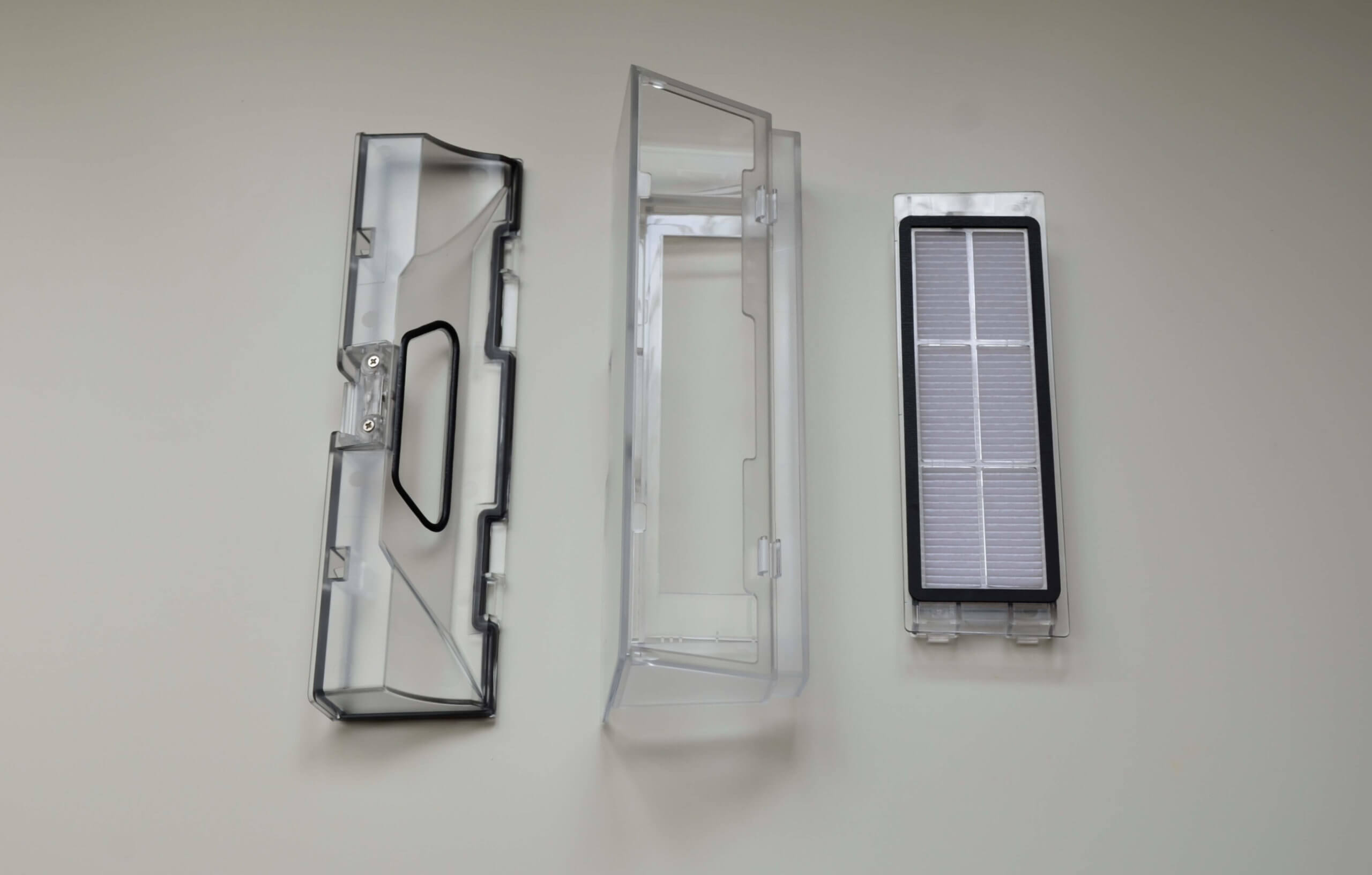 Pats vandens bakas yra šiek tiek padidintas ir talpina iki 180 ml skysčio, palyginti su ankstesnės versijos 150 ml talpa. Vanduo pilamas per specialią angą su sandariu vožtuvu. Valymo šluostė pritvirtinta prie galinės dalies „Velcro“ juosta ir įstatoma į specialų griovelį priekyje. Po valymo šluoste rasite keičiamus dozatorius ir vandens lygio reguliavimo mechanizmą. Jis turi du nustatymus, kaip ir senesnis „Roborock S6“ modelis. Vanduo ant valymo šluostės teka gravitacijos būdu.