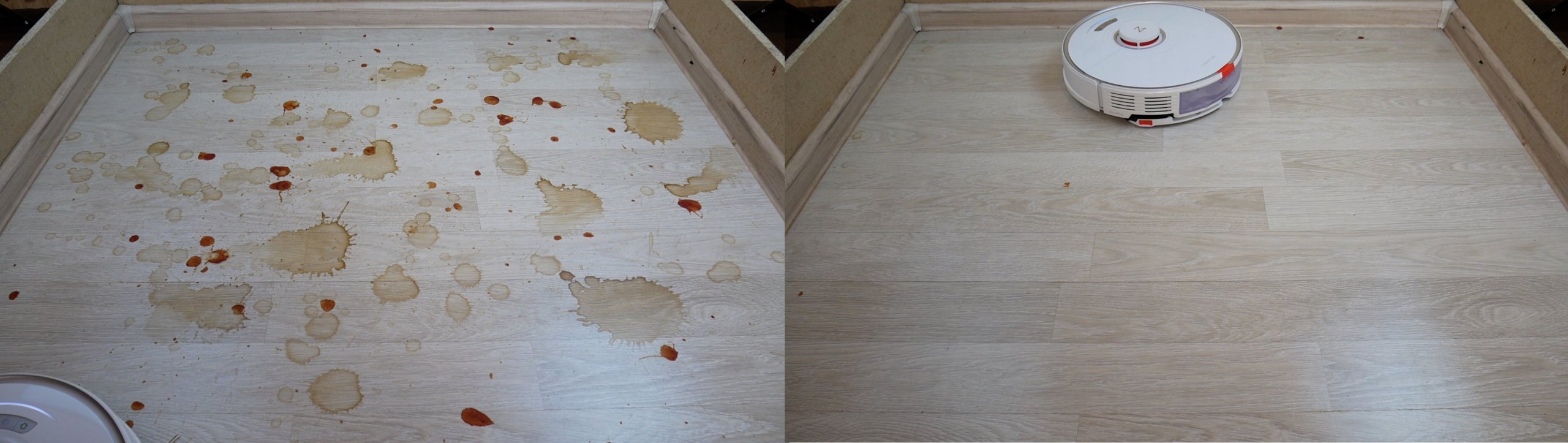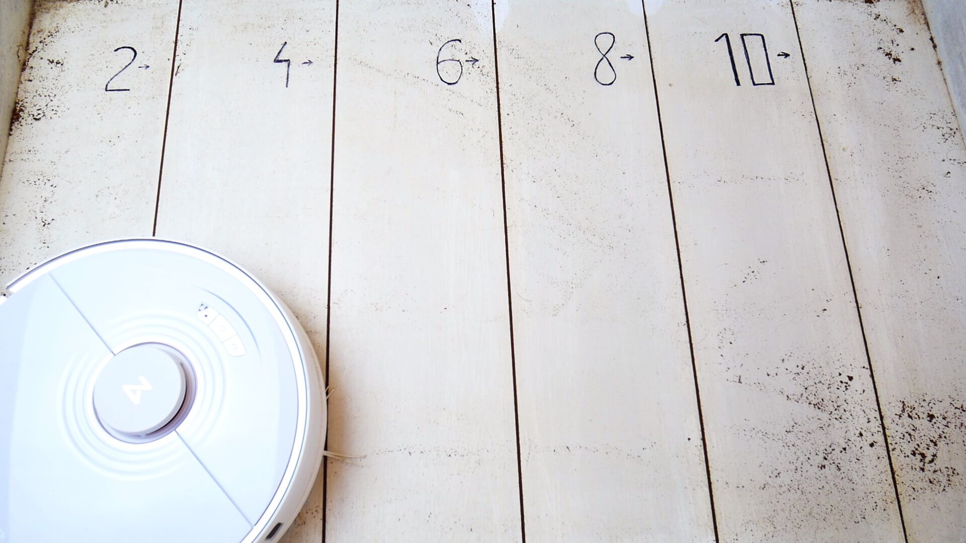 Čia bus atlikti du testai. Pirma, standartinis testas: kaip gerai robotas dulkių siurblys pašalina šiek tiek pridžiūvusius nešvarumus nuo grindų. Šią užduotį jis atliko gerai. Išilgai grindjuostės liko tik maža juostelė, kurios dėl savo konstrukcijos ypatybių negalėjo pašalinti nė vienas iš mūsų išbandytų robotų dulkių siurblių.